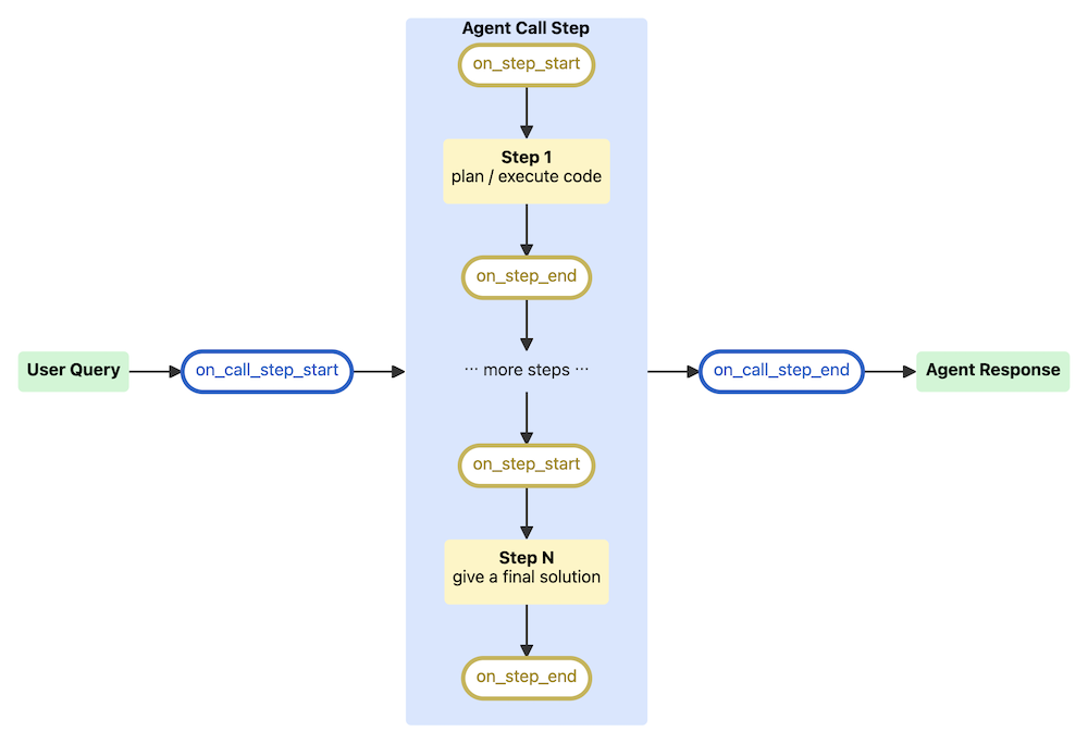 After a user makes a query, the agent follows a sequence of steps to respond with a relevant answer. The call lifecycle begins with the initial call step on_call_step_start and ends with on_call_step_end.