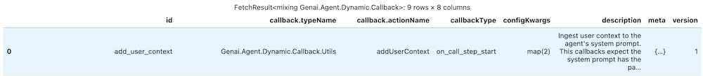 c3.Genai.Agent.Dynamic.Callback.forId("add_user_context")Next, set up a Genai.Agent.Dynamic.OnStepCallbackSpec spec to add the lambda callback to the agent.