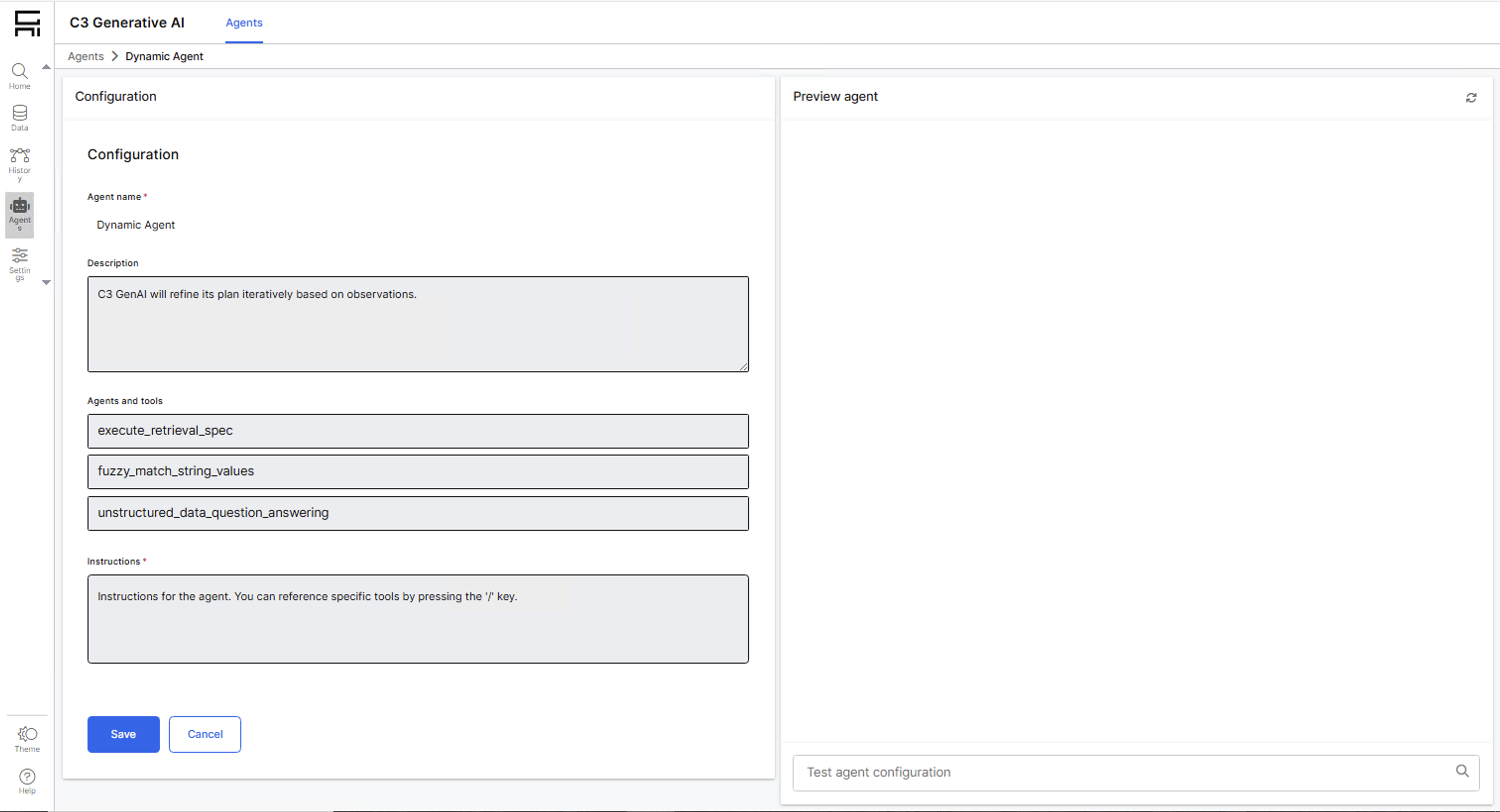 The C3 Generative AI Application includes the Dynamic Agent. This agent understands questions, selects tools, and returns a text or visual response. It supports multi-step queries and can use multiple tools as needed.