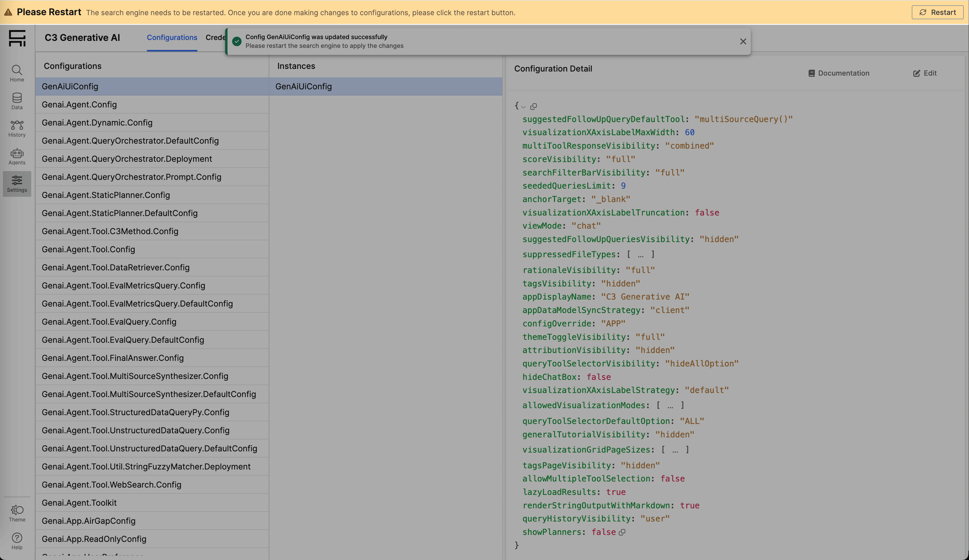 - Select "Restart" on the banner on the top of the screen. This will restart the Search Engines, and after this processes the config changes will be reflected in the app. Notice this can affect background processes such as indexing.