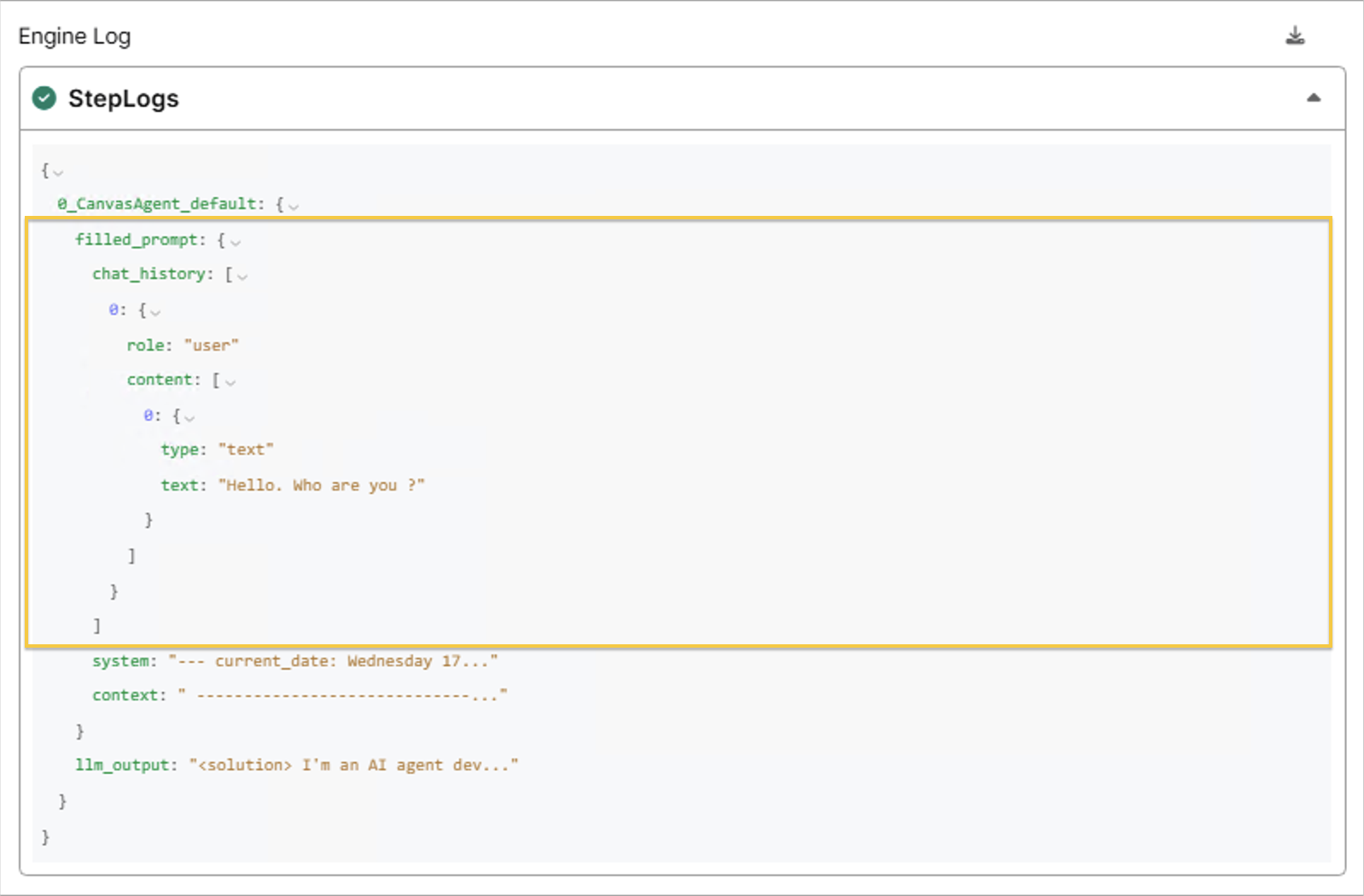 When Dynamic Agent appears to "forget" previous conversation context, examine the chat history section. The default configuration maintains 10 steps of history, but session errors can truncate this. Locate filled_prompt -> chat_history -> content in the JSON structure.