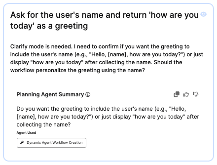 In the Workflows chat, enter a prompt into the C3 AI Workflow Agent. Structure the prompt explicitly so each node is associated with a task. A prompt example is: "Ask for the user's name and return 'how are you today' as a greeting."