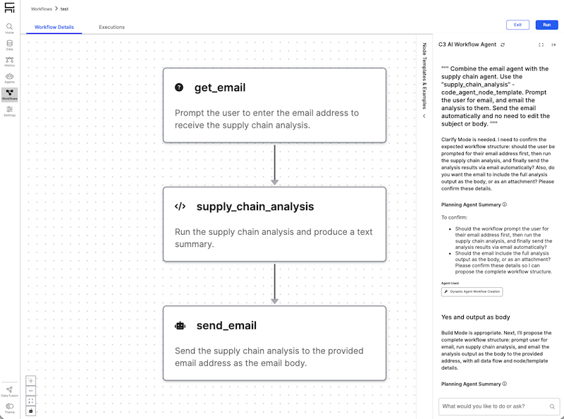 C3 AI Workflows allow you to build workflows that handle complex business processes by breaking them into smaller, manageable steps. In this guide, you will build an email agent workflow and a supply chain agent workflow and combine them to do a multi-step business process.