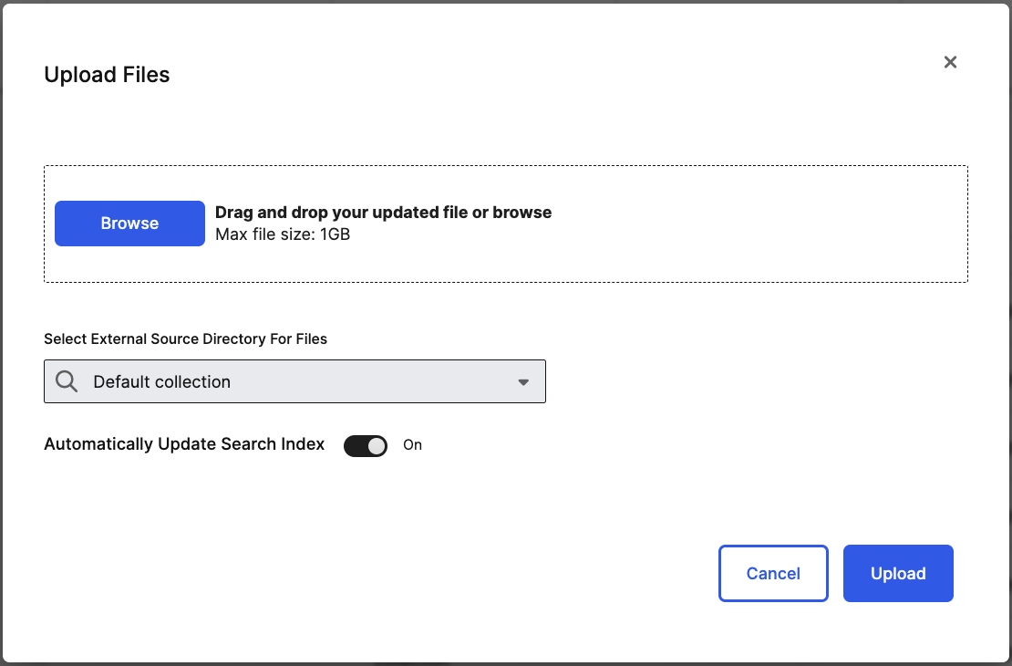 Automatically Update Search Index: To start adding the uploaded files to the search index, choose to Automatically Update Search Index. Otherwise, you can manually add documents to the search index at a later time. See Add Documents to Search Index for more instructions.