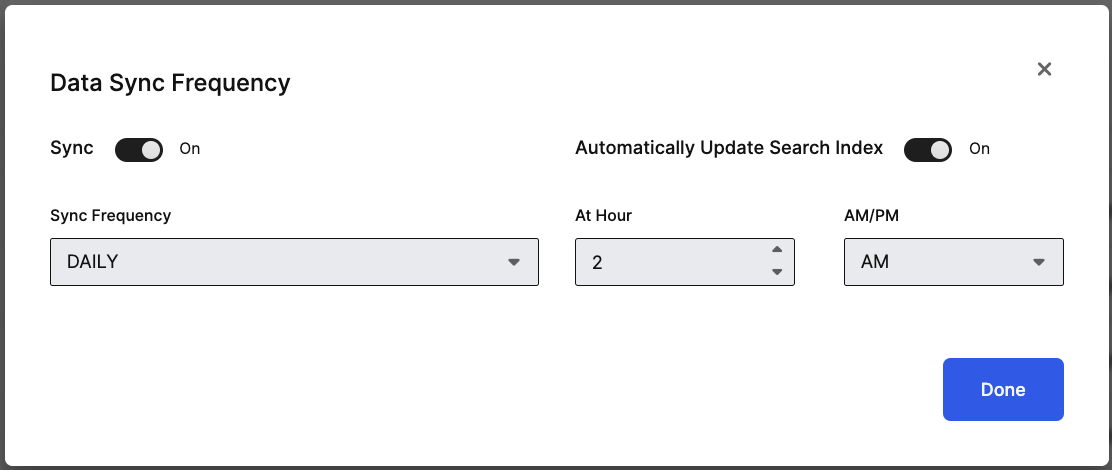 Select Frequency and Time of Day: Identify how frequently you want to update your search index. Administrators can sync daily, and can specify what time of the day the sync should occur.