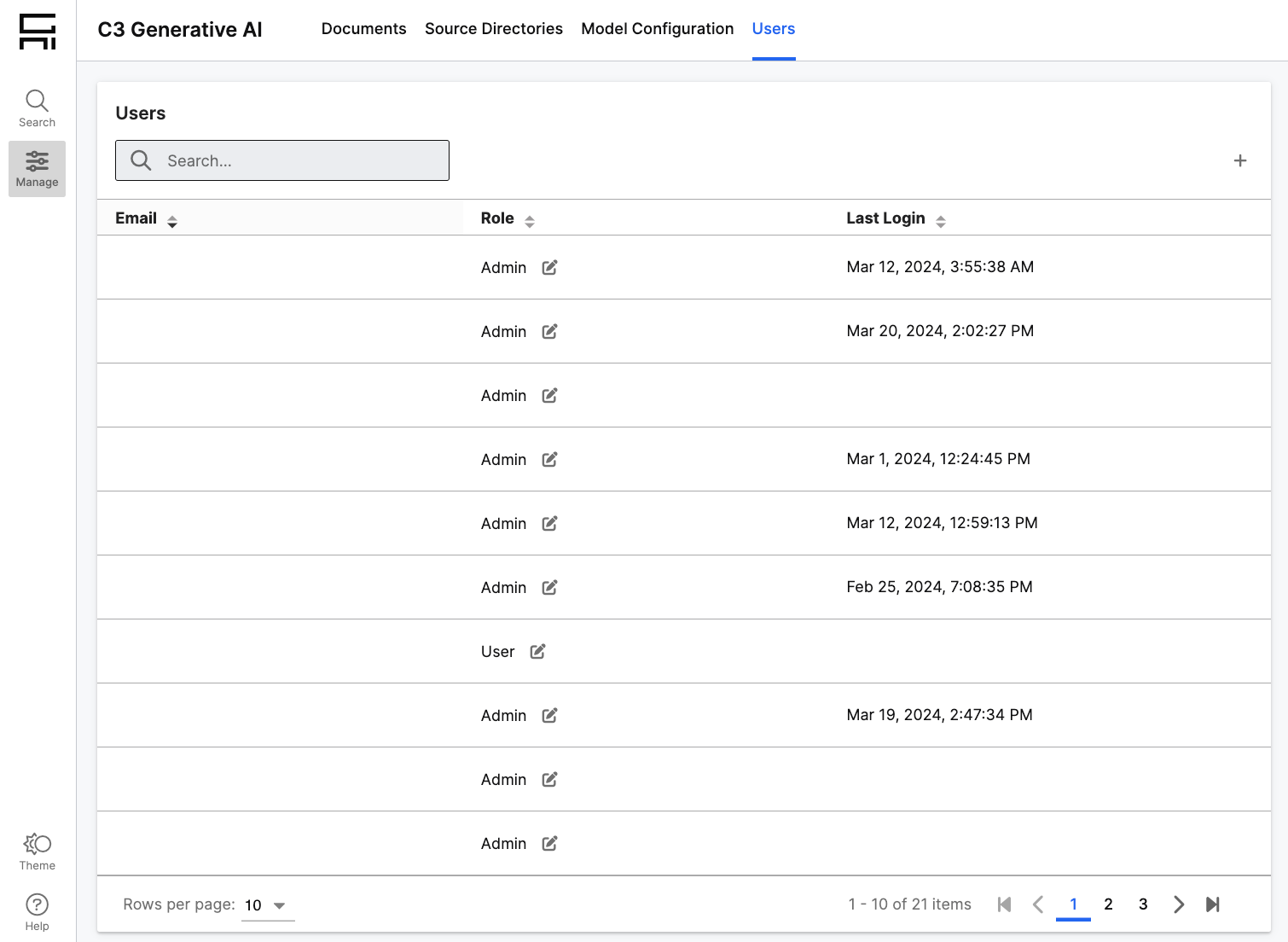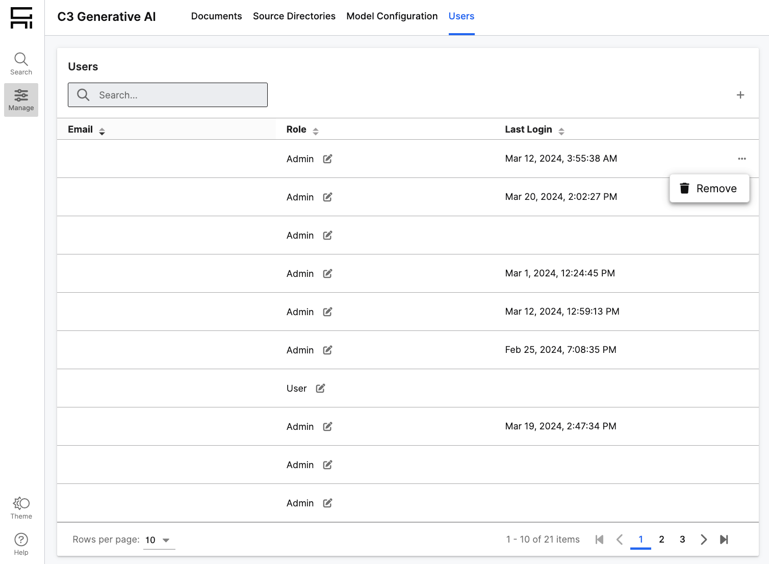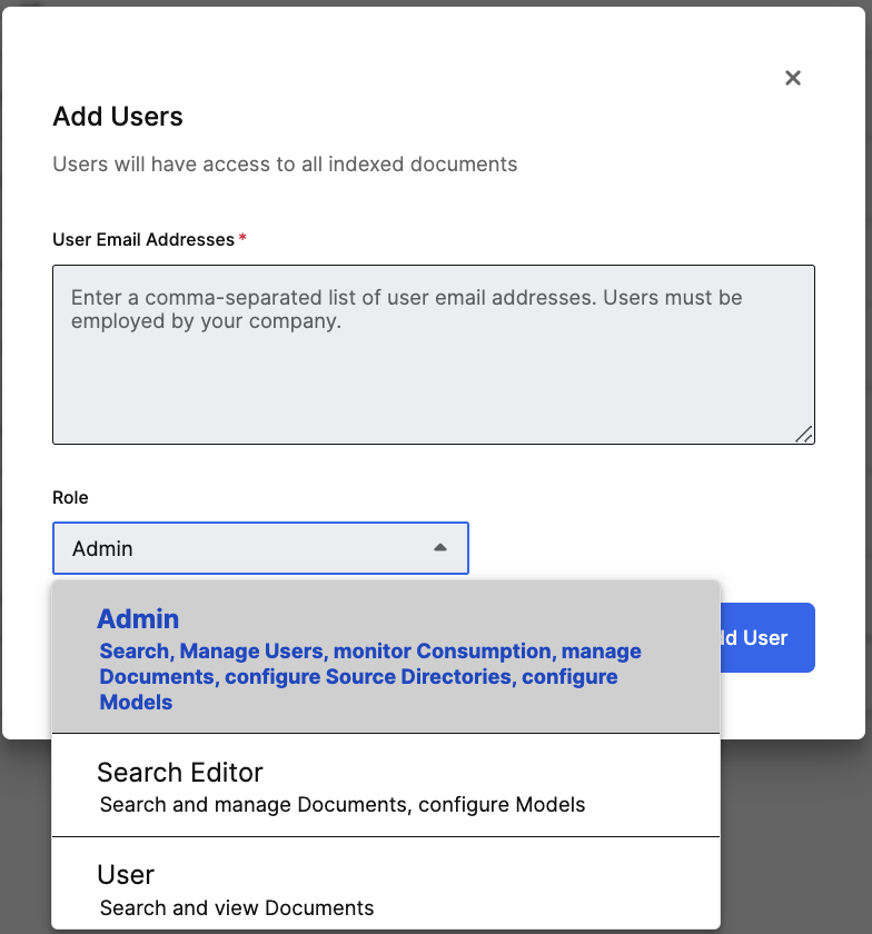 Specify User Roles: When adding users, specify which role they should have. You can use roles to identify what users can access. Users can search and view documents. Search Editors can search, upload documents, add & remove documents from the index, and configure models. Admins have access to all application features. You can also modify a user’s role after granting initial access to the application.