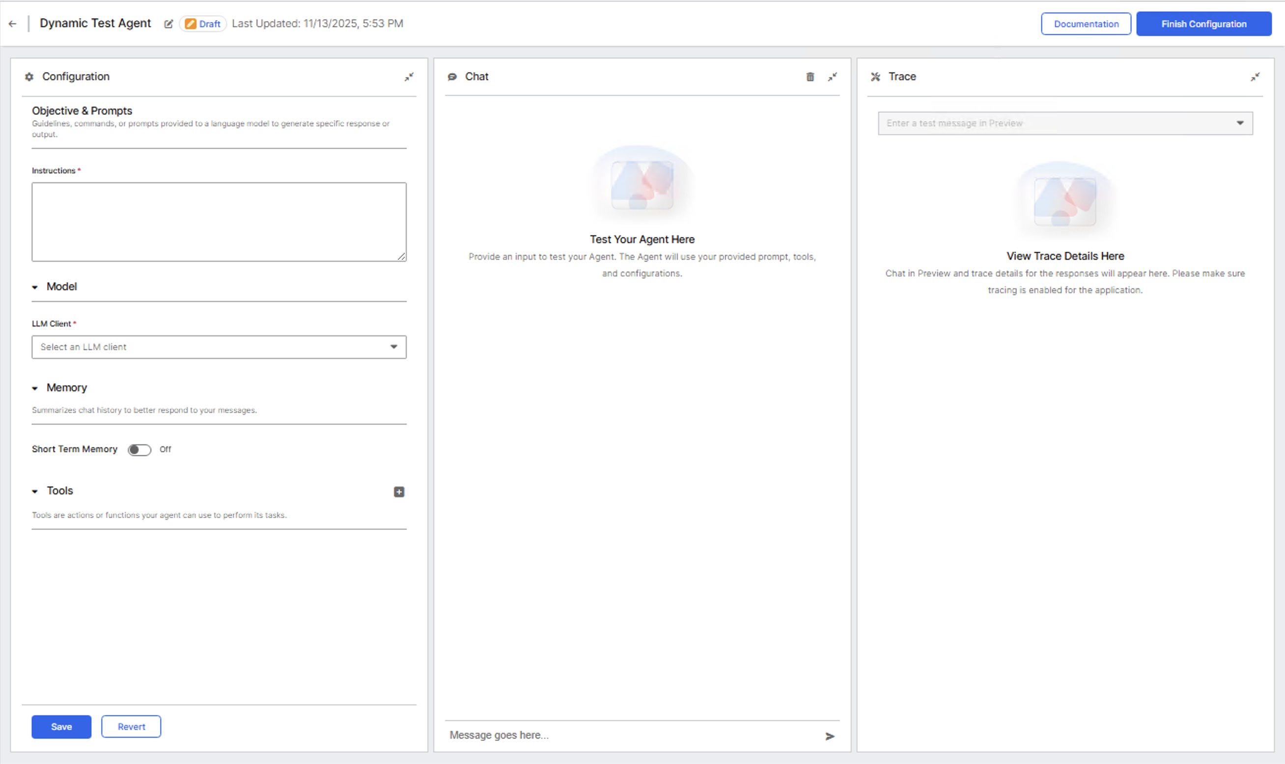 - Chat (center): Test your agent with a live chat interface.