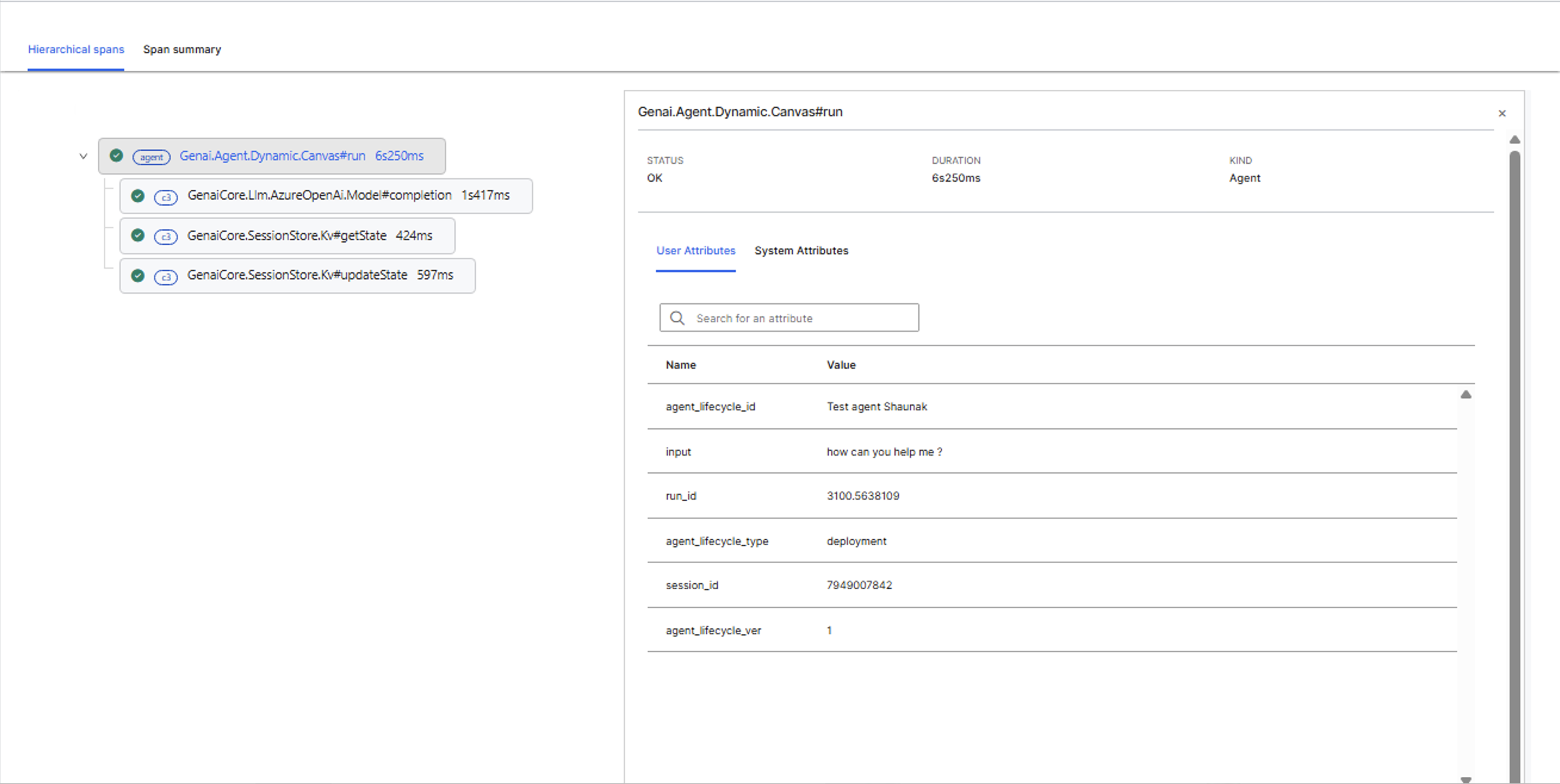 Select any span in the tree to view its details in the right panel. The panel includes: