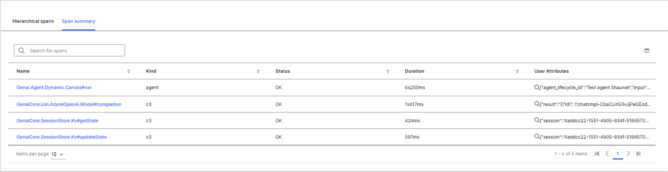 Select the Span summary tab to see all spans in a flat table format. The table includes: