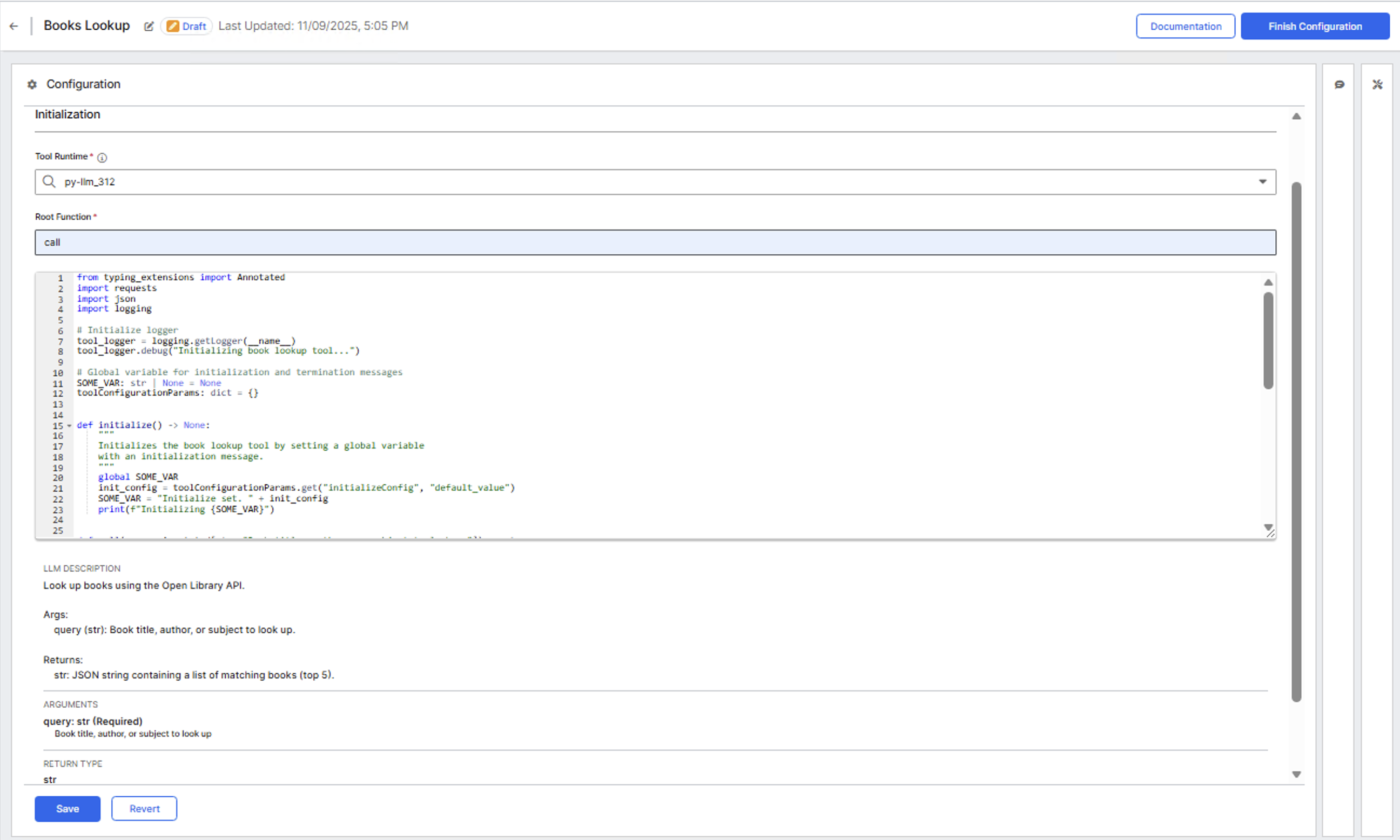 - Configuration (left): Define the tool's runtime, function entry point, and Python logic.