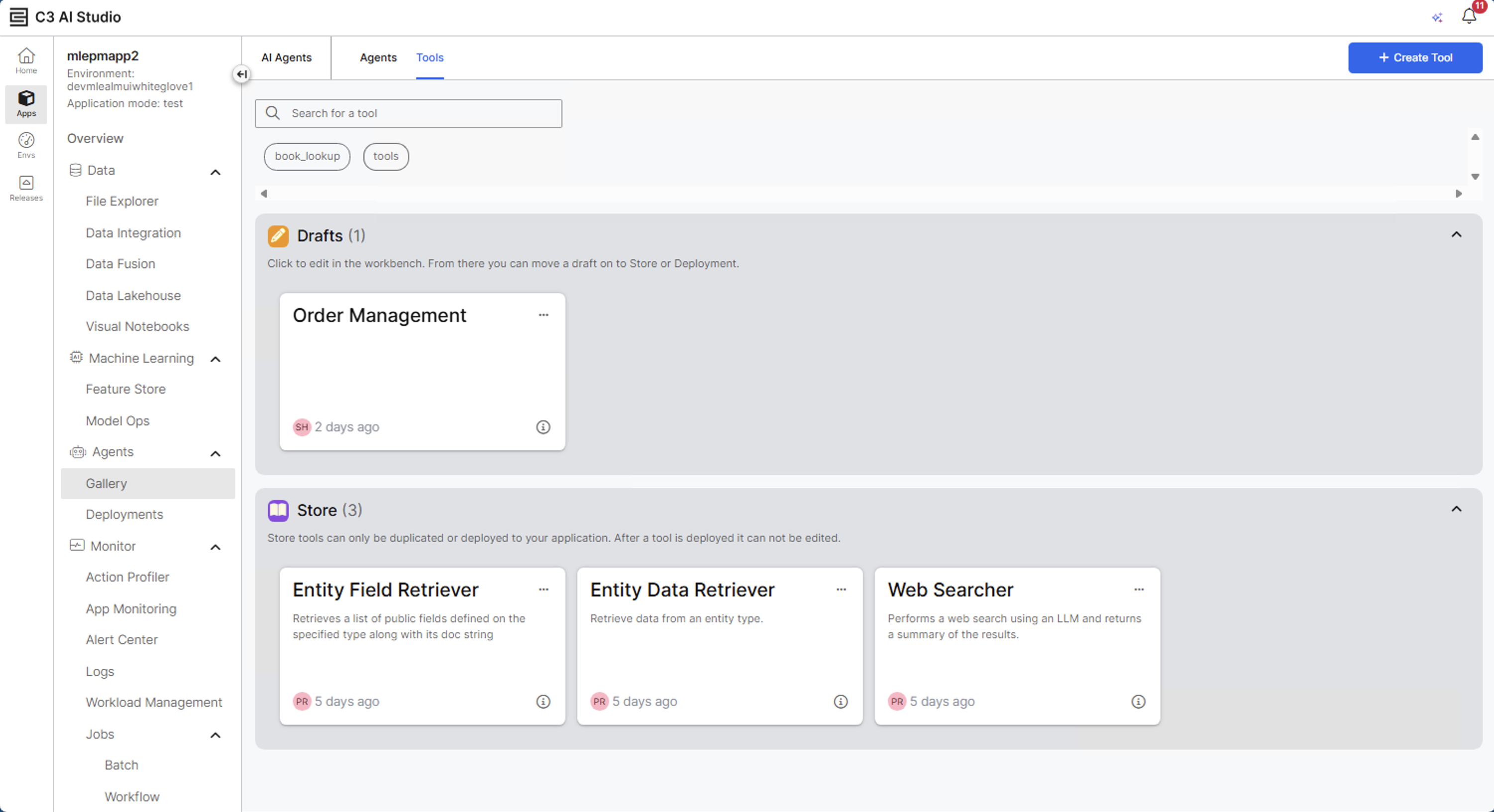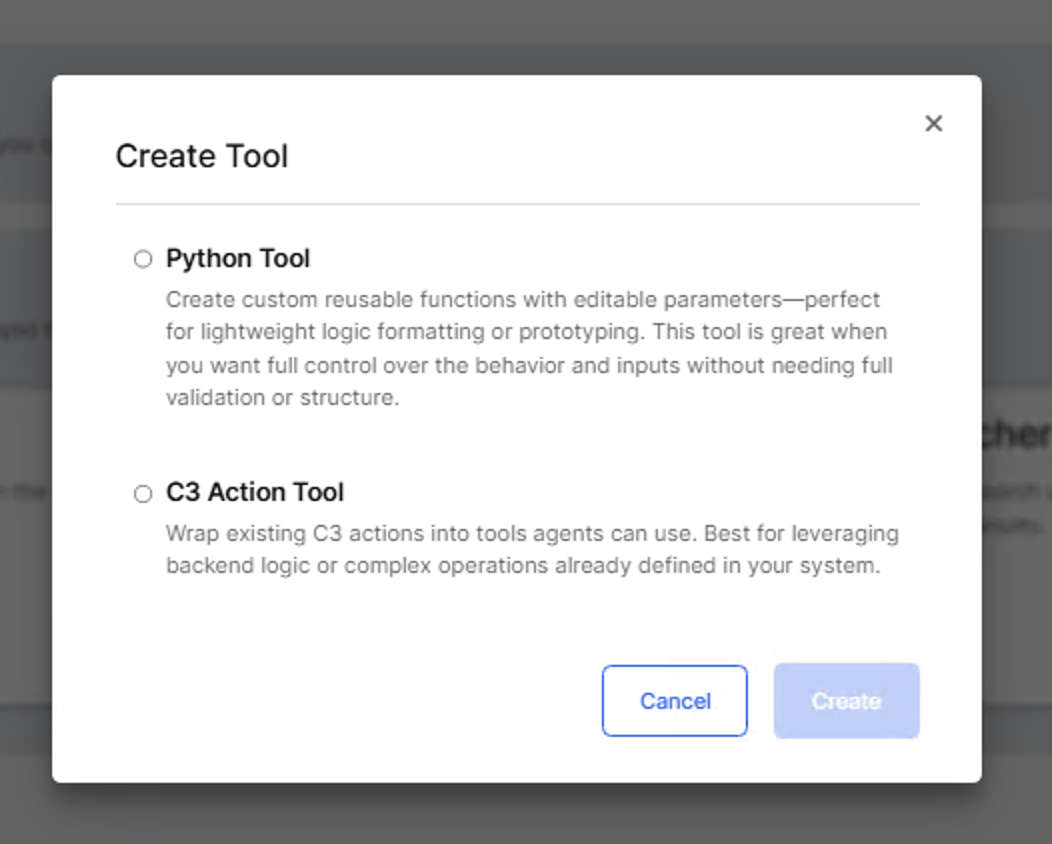- C3 Action Tool: Wraps existing C3 Type methods into callable tools. Use this option to expose backend logic or C3 Actions to agents.