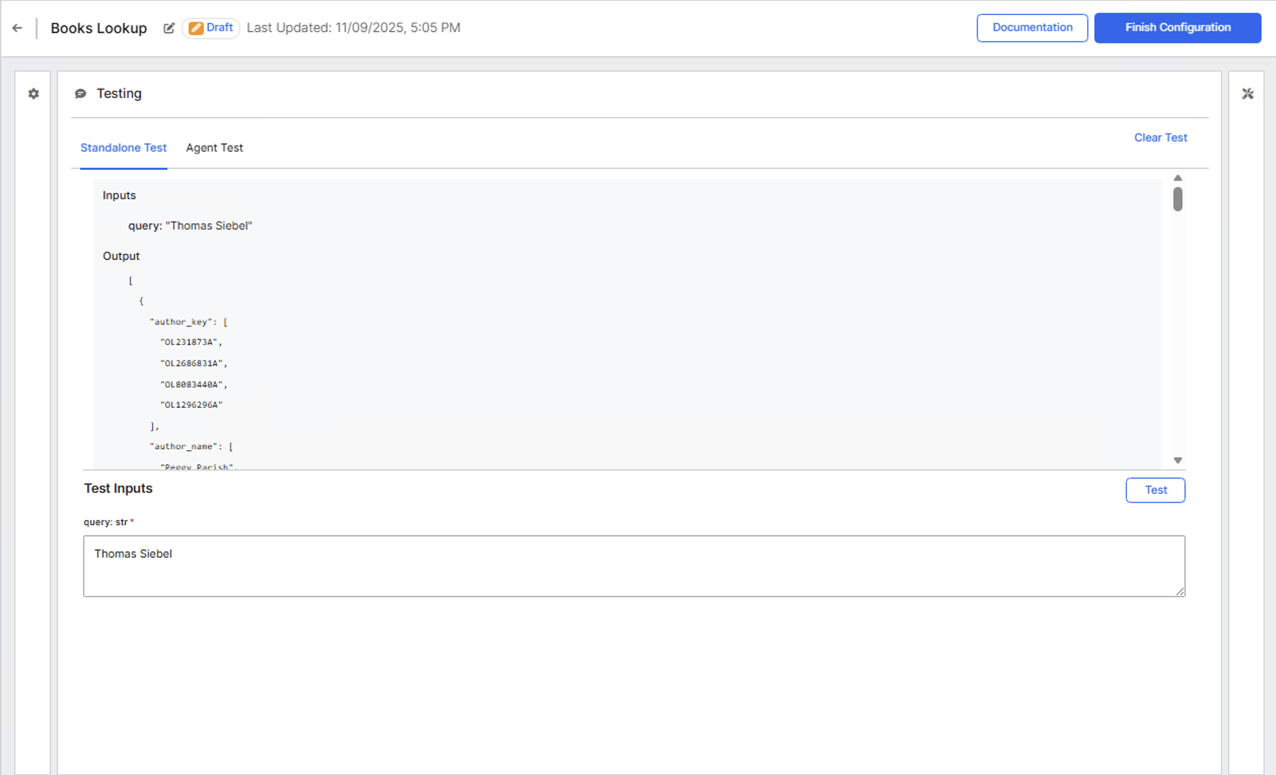 - Agent Test: Runs the tool within an agent workflow to validate interaction and context handling.