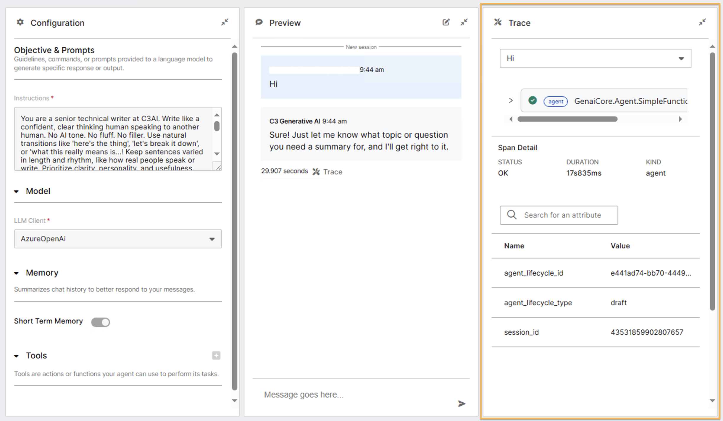 When you test agents in the Agent Workbench or monitor deployed agents through the Deployments page, the C3 Agentic AI Platform provides observability for: