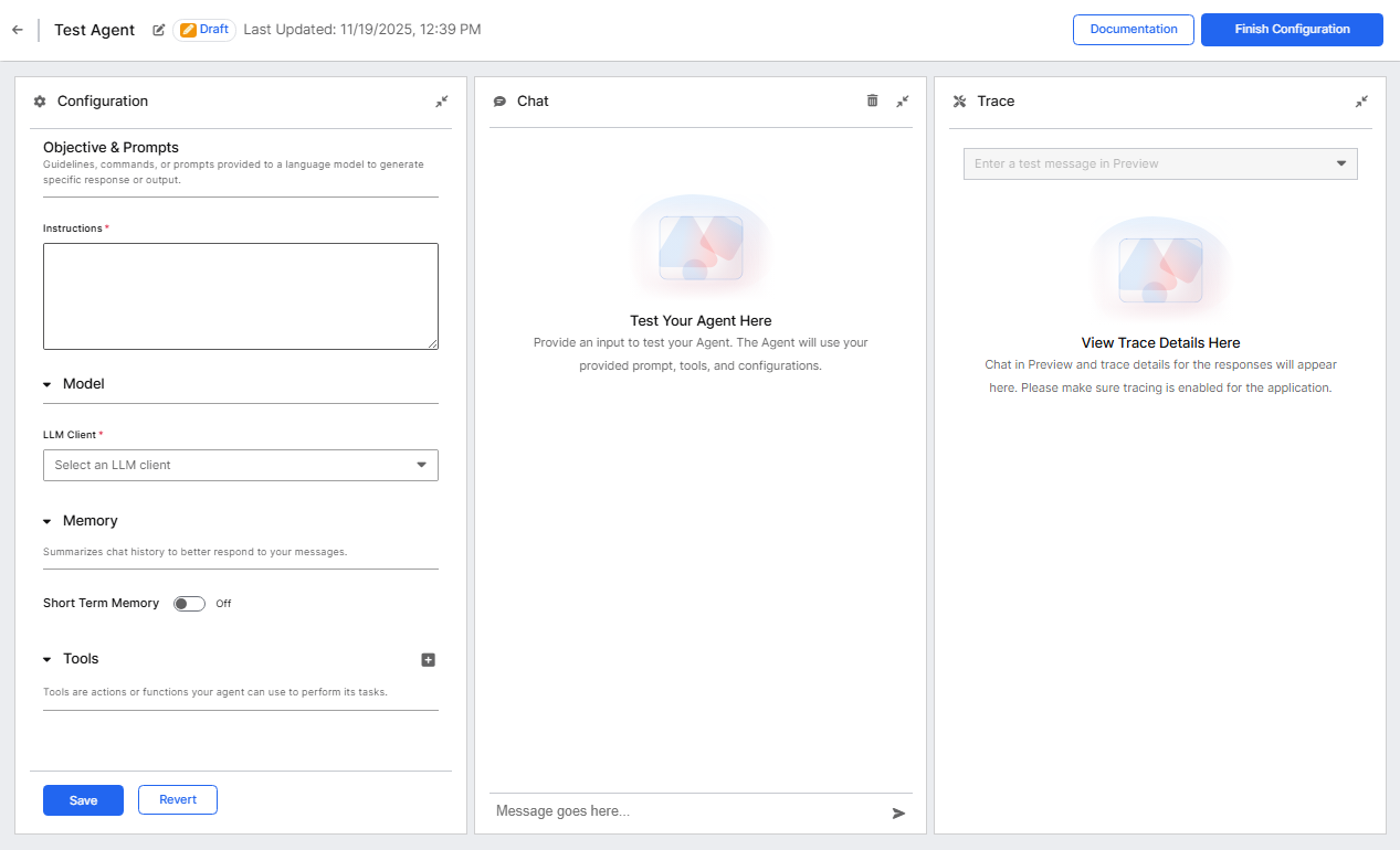 - Chat (center): Live chat interface to test agent responses.