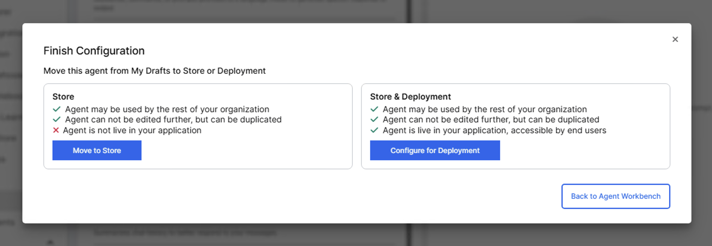 After you configure your agent, select Finish Configuration in the agent workbench. You have two deployment options: