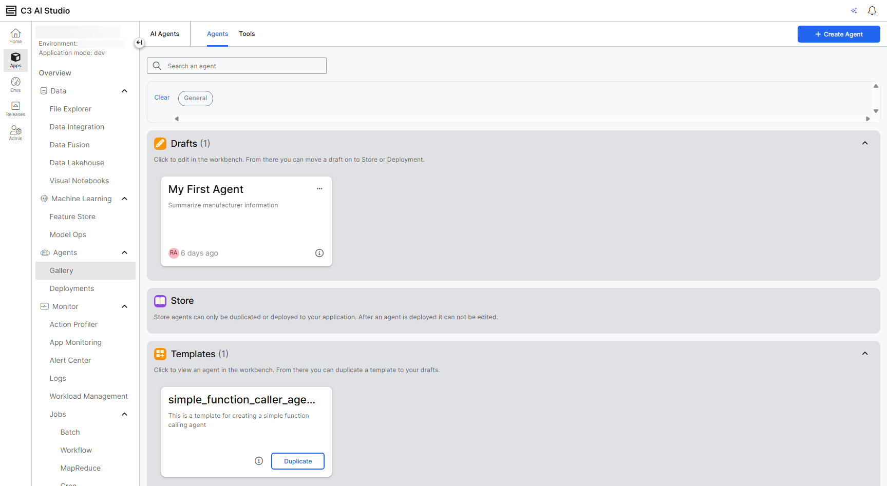 C3 AI Studio contains tools for building, managing, and deploying AI agents in your application. To learn more, see the Agent Gallery in C3 AI Studio.