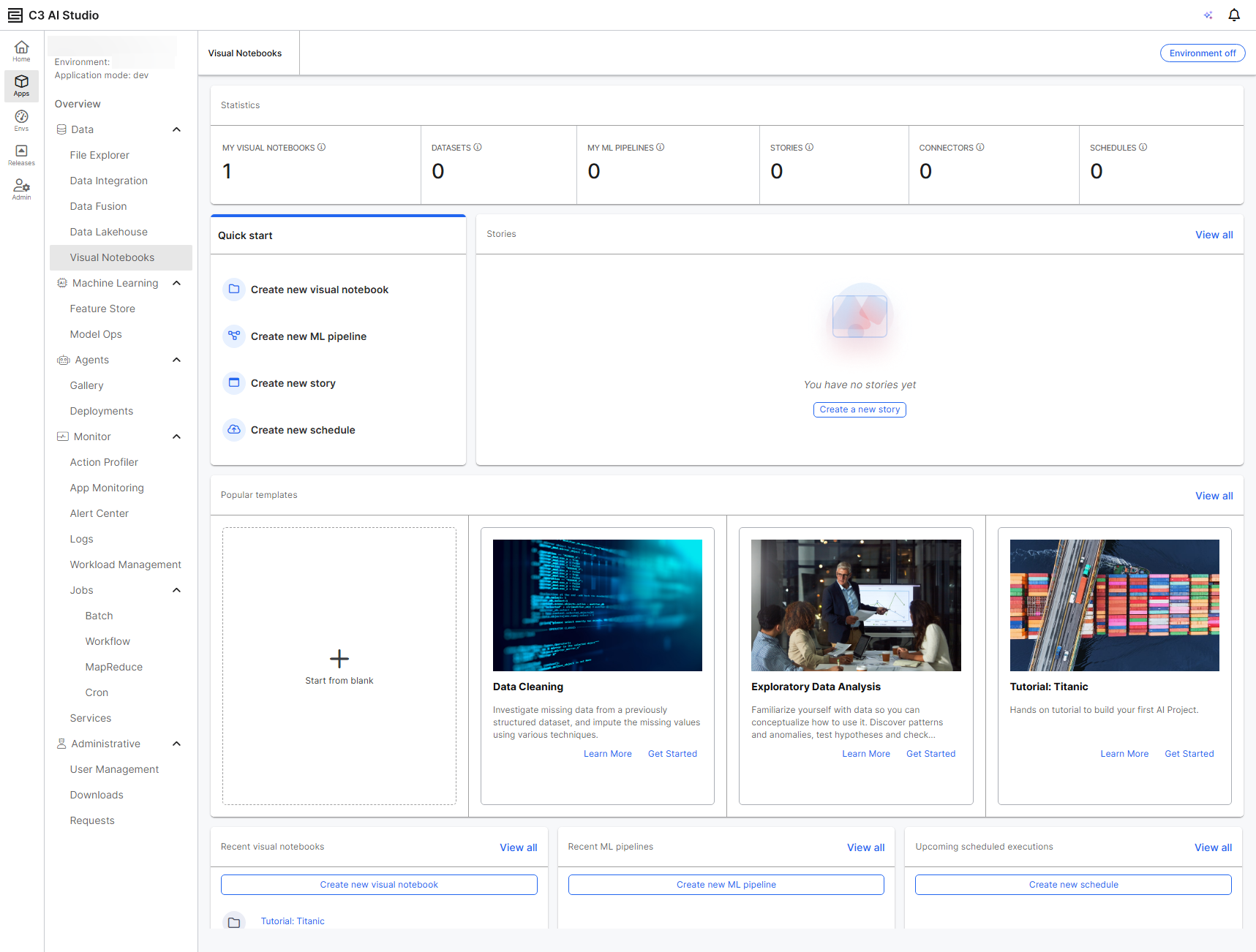 Use C3 AI Studio to set up the workspace, resources, and dependencies needed to build and deploy C3 AI applications. Create environments and applications without writing code or entering console commands.