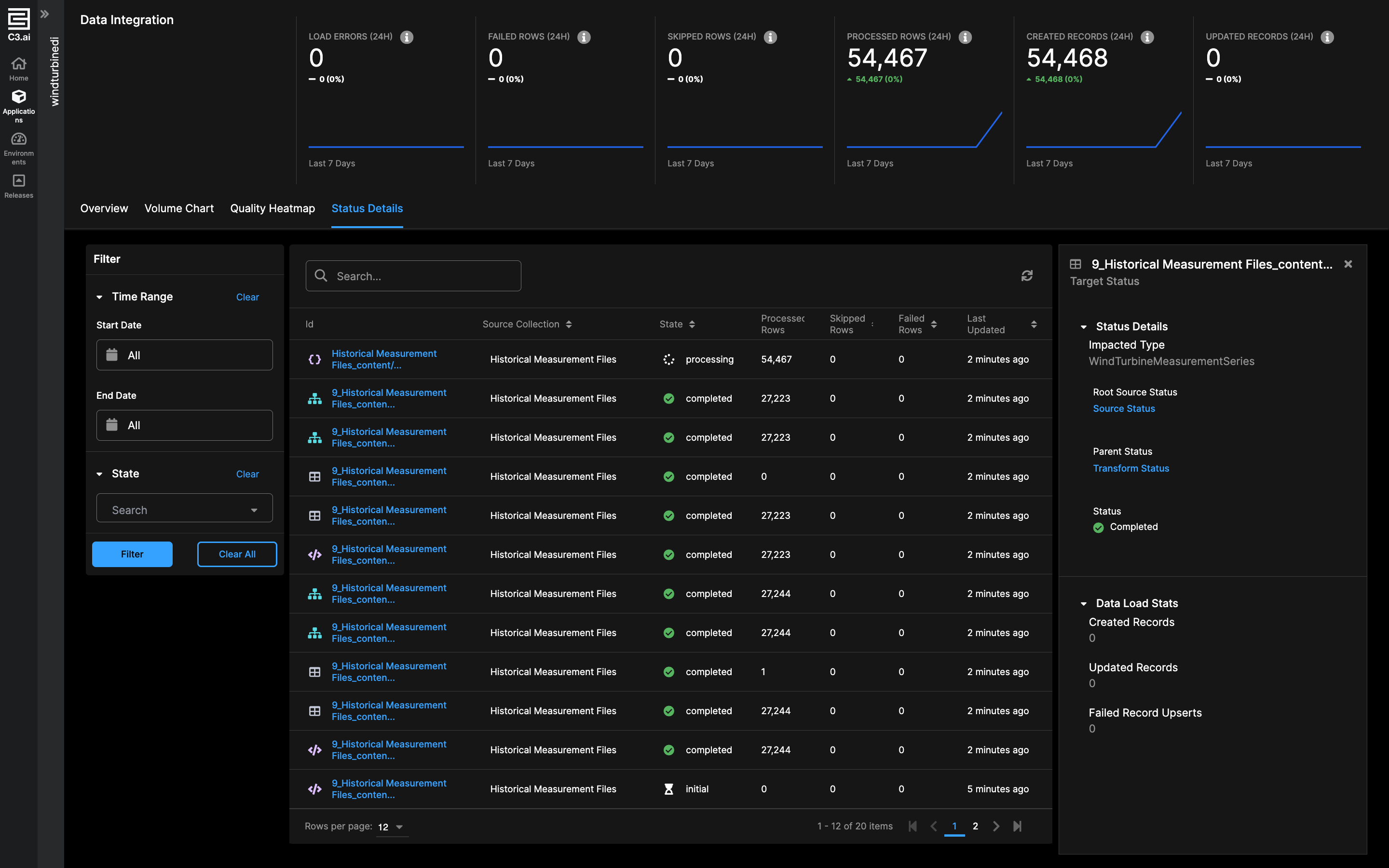 Data Integration in C3 AI Studio centralizes data ingestion and monitors its movement through pipelines. Teams can see data load activity, current status, and historical trends across development and production environments.