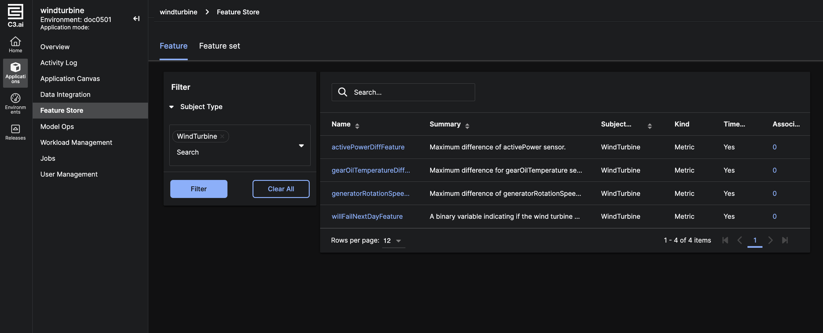 Access Feature Store by selecting Feature Store in your application sidebar. To learn more about the Feature Store in C3 AI Studio, see Feature Store. For more information on the Type system, see C3 AI Type System.