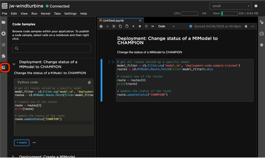 Code Samples extension: The C3 AI Code Samples extension in JupyterLab allows you to insert pre-written blocks of Python into your notebooks. Code is provided for a variety of commonly used code patterns and functions: author new samples by right-clicking cells in the notebook. To get the latest code samples, include the tutorials package as an application dependency.