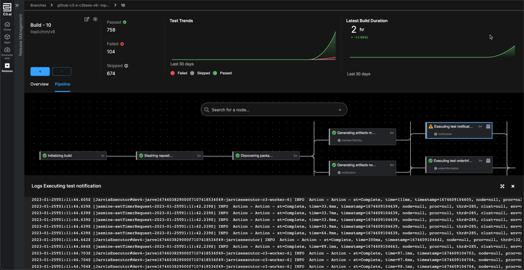 C3 AI Release Management is a native continuous integration tool within C3 AI Studio. It is an integrated environment that you can use to manage branches, configure CI triggers, visualize CI pipelines and errors, and analyze build artifacts and test metrics across applications.