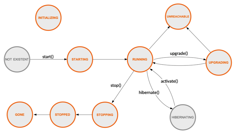 The diagram below illustrates the typical states and transitions of a Cluster, Env, or App. See CloudCluster.State.