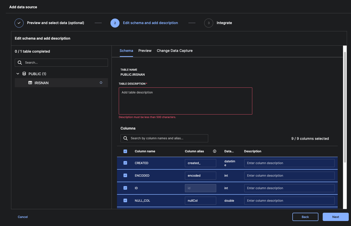 After selecting a source table, the Edit schema and add description step allows you to review the table structure, document its purpose, and prepare it for CDC configuration.