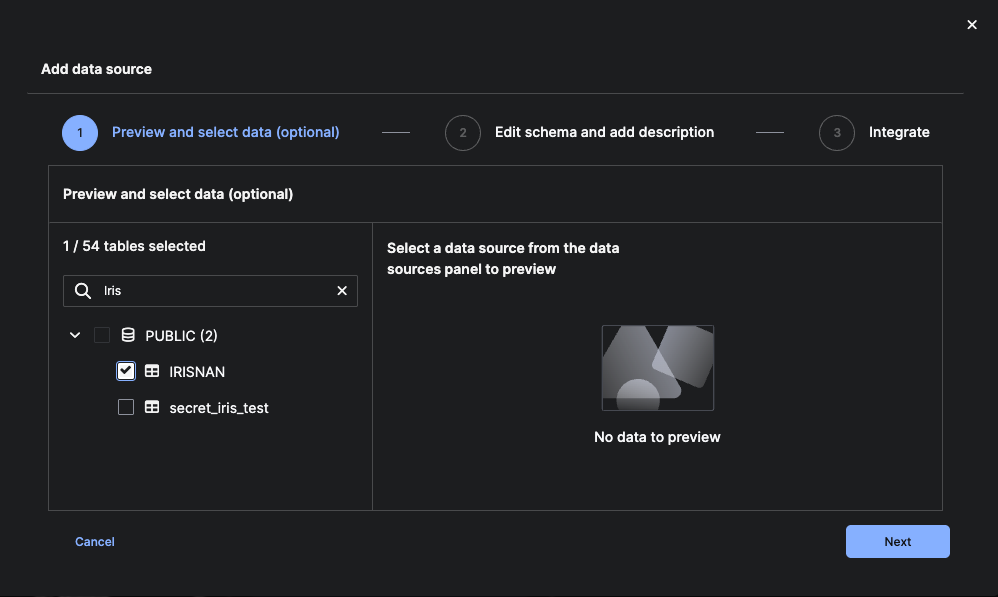 In the Add data source dialog, under Preview and select data, choose the tables to include for CDC: