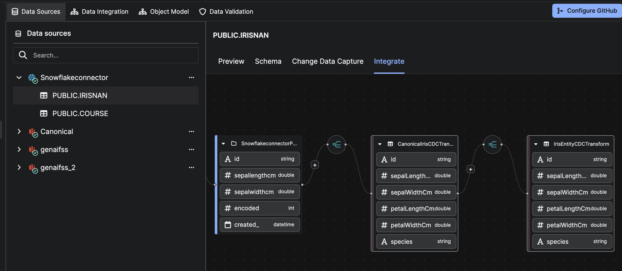 In the left panel, the selected table (e.g., PUBLIC.IRISNAN) appears under its parent source system (e.g., SnowflakeConnector), confirming registration as a CDC-enabled dataset.
