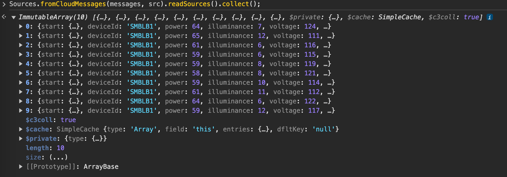 Sources.fromCloudMessages(messages, src).readSources().collect();The following is an example of the output from running the above example code snippet.
