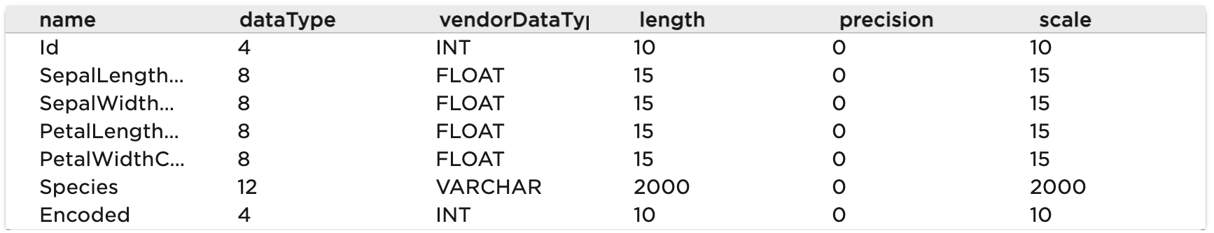 SqlSourceCollection.forName("Iris").connect().columns;