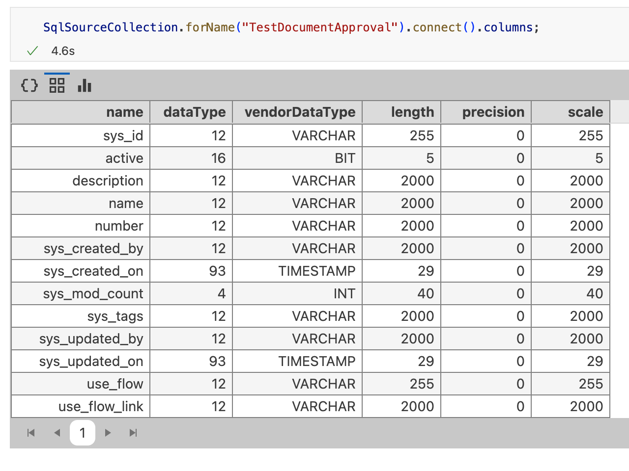 SqlSourceCollection.forName("TestDocumentApproval").connect().columns;