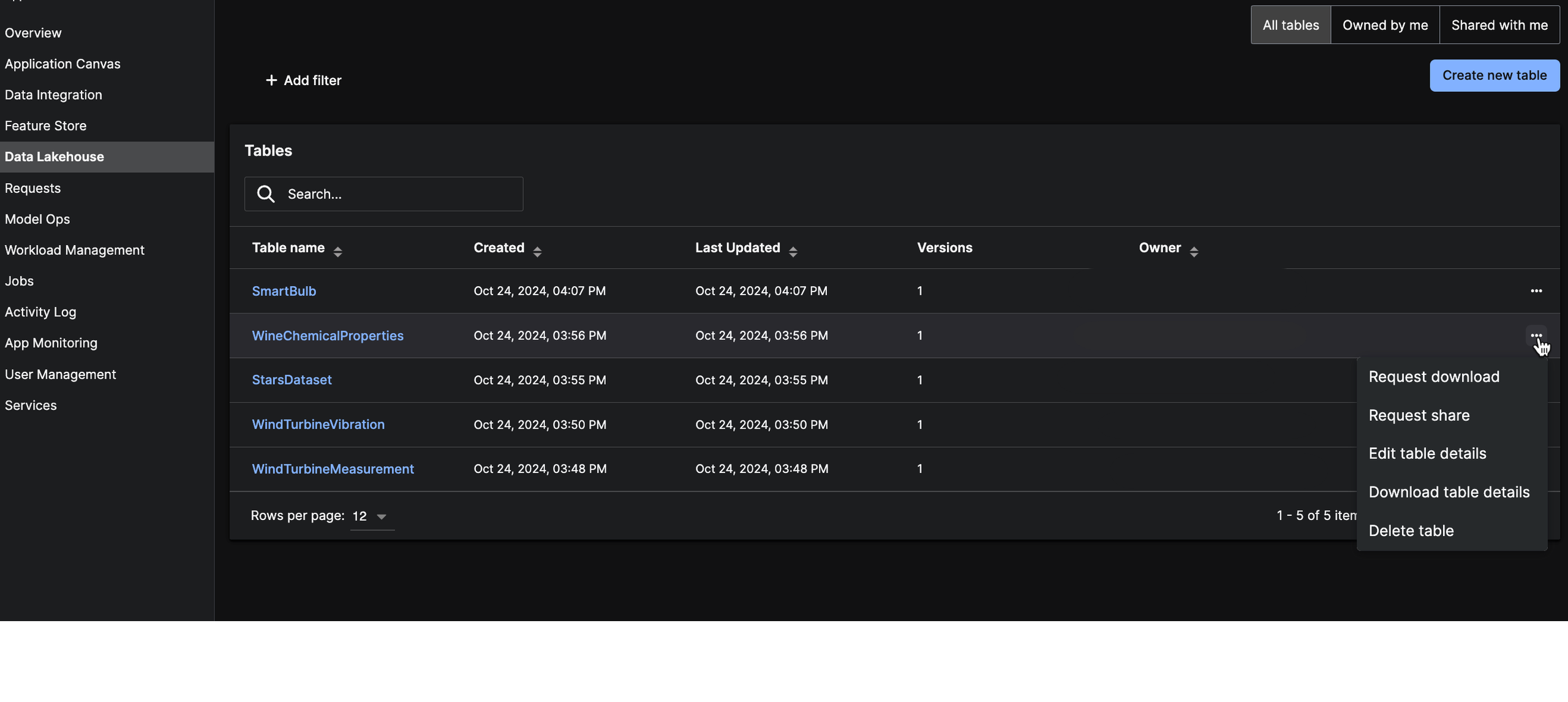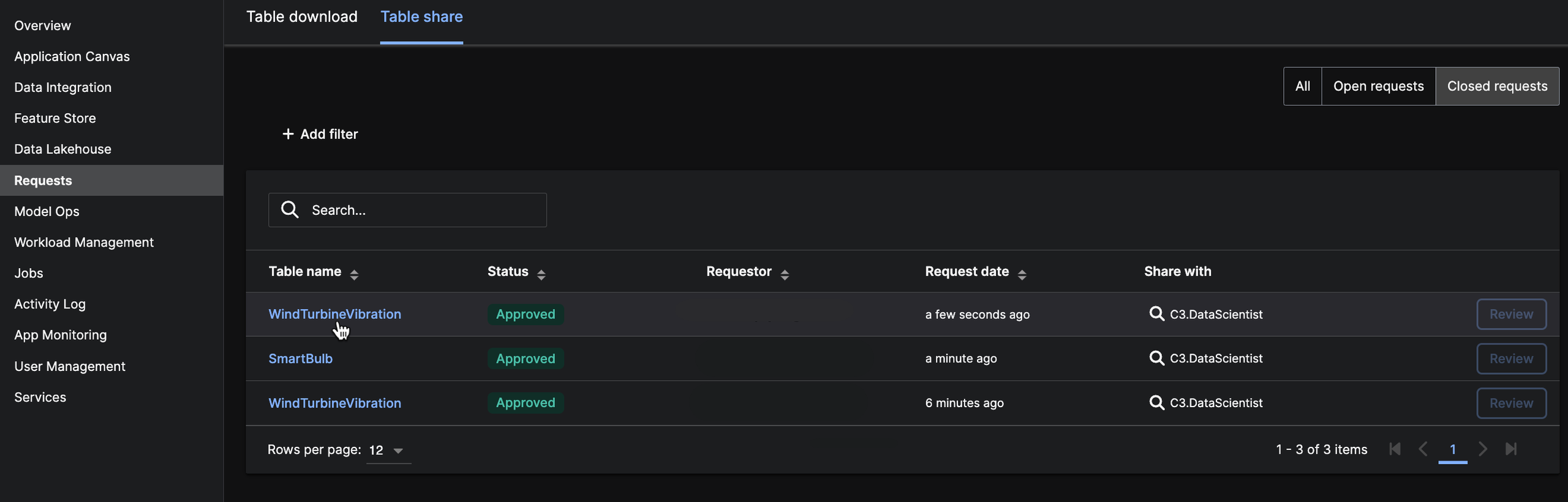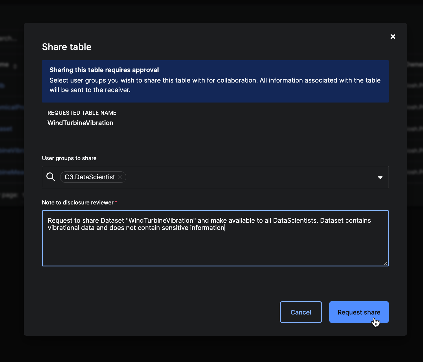 C3 AI Datasets can be kept private or shared with colleagues using sharing with a C3 AI user group