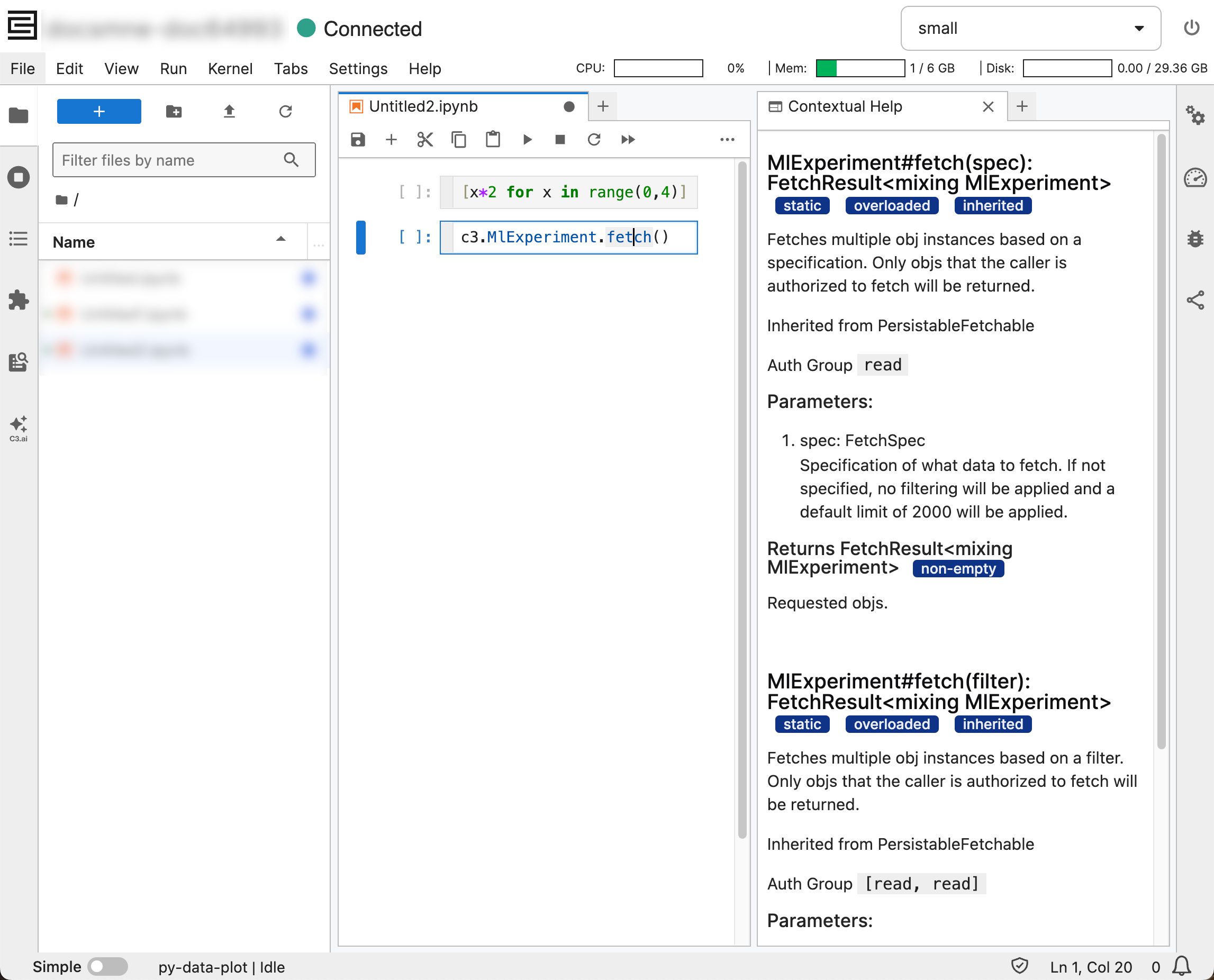 c3.MlExperiment.fetch()Place the cursor on MlExperiment to show the following in Contextual Help:
