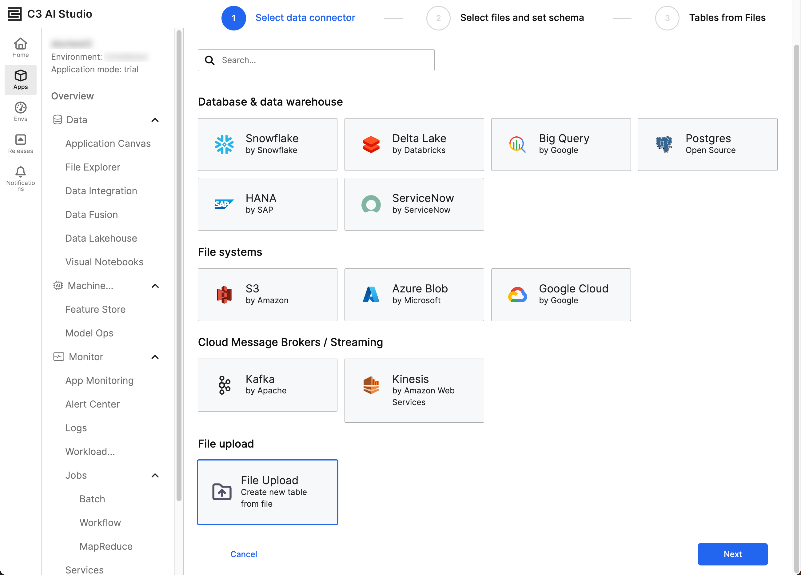 To upload data, select the name of your app from C3 AI Studio and navigate to the Data Fusion tab. Select Add Data Source at the bottom of the Data Sources tab. The Add data source workflow appears, prompting you to select a data connector.