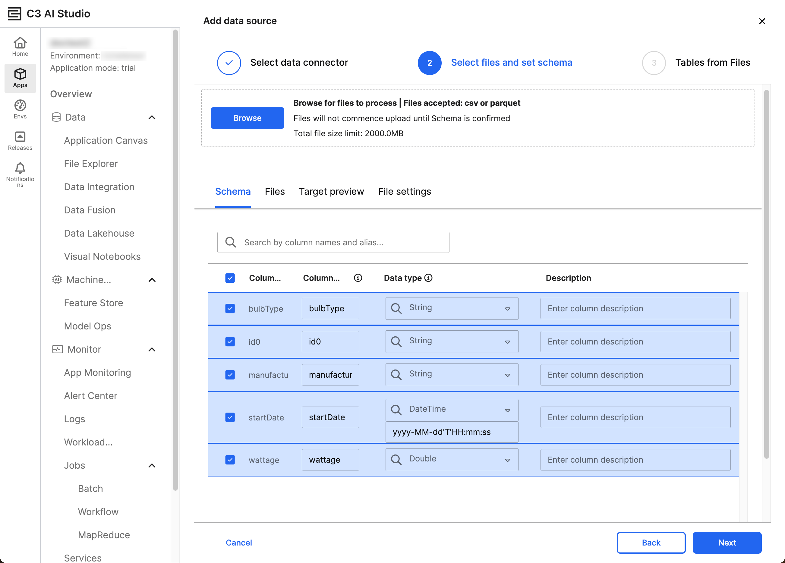 - Schema — Review the schema and modify the Column alias or Description fields.