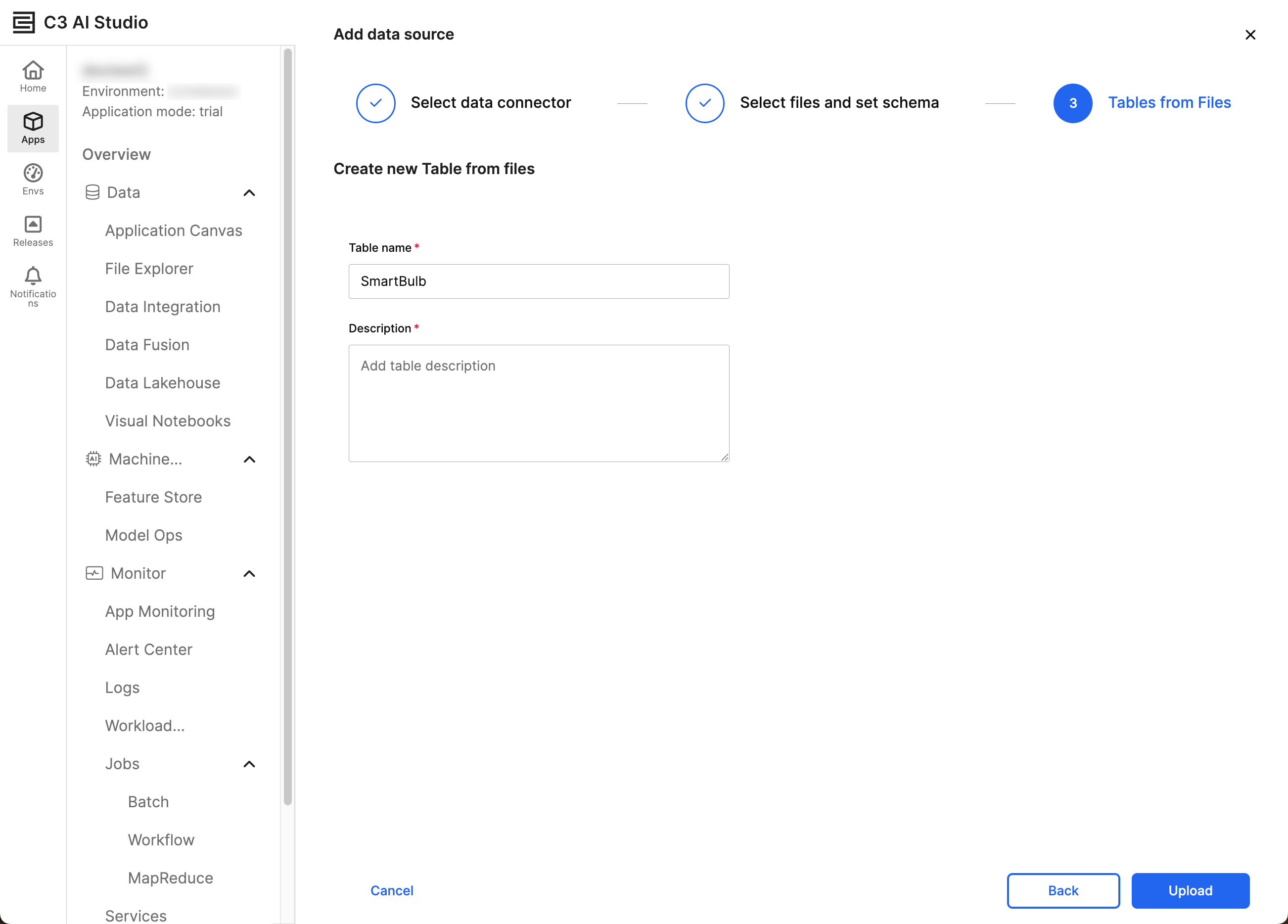 In the Tables from Files workflow stage, enter the Table name and Description. Select Upload to start the upload process for your files. Data Fusion notifies you when the files complete their upload.
