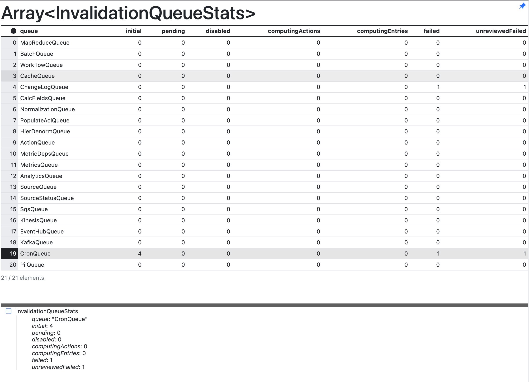 c3Grid(InvalidationQueue.countAll())to output theInvalidationQueuestats in a readable grid and find the CronQueue row.