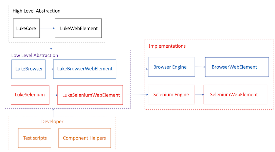 Luke is designed to allow you to write tests in a way that's agnostic to the automation engine being used. The key to this are the LukeCore and LukeWebElement interfaces. These interfaces define abstract methods that are implemented by the engine-specific Types: