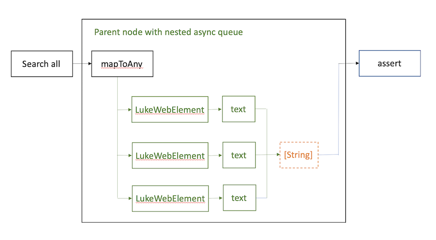 For example, LukeCore#searchAll returns a LukeAsyncQueueCollection<LukeWebElement>. If you want to get the text of all dom elements and resolve them as a collection, you can use LukeAsyncQueueCollection#mapToAny.