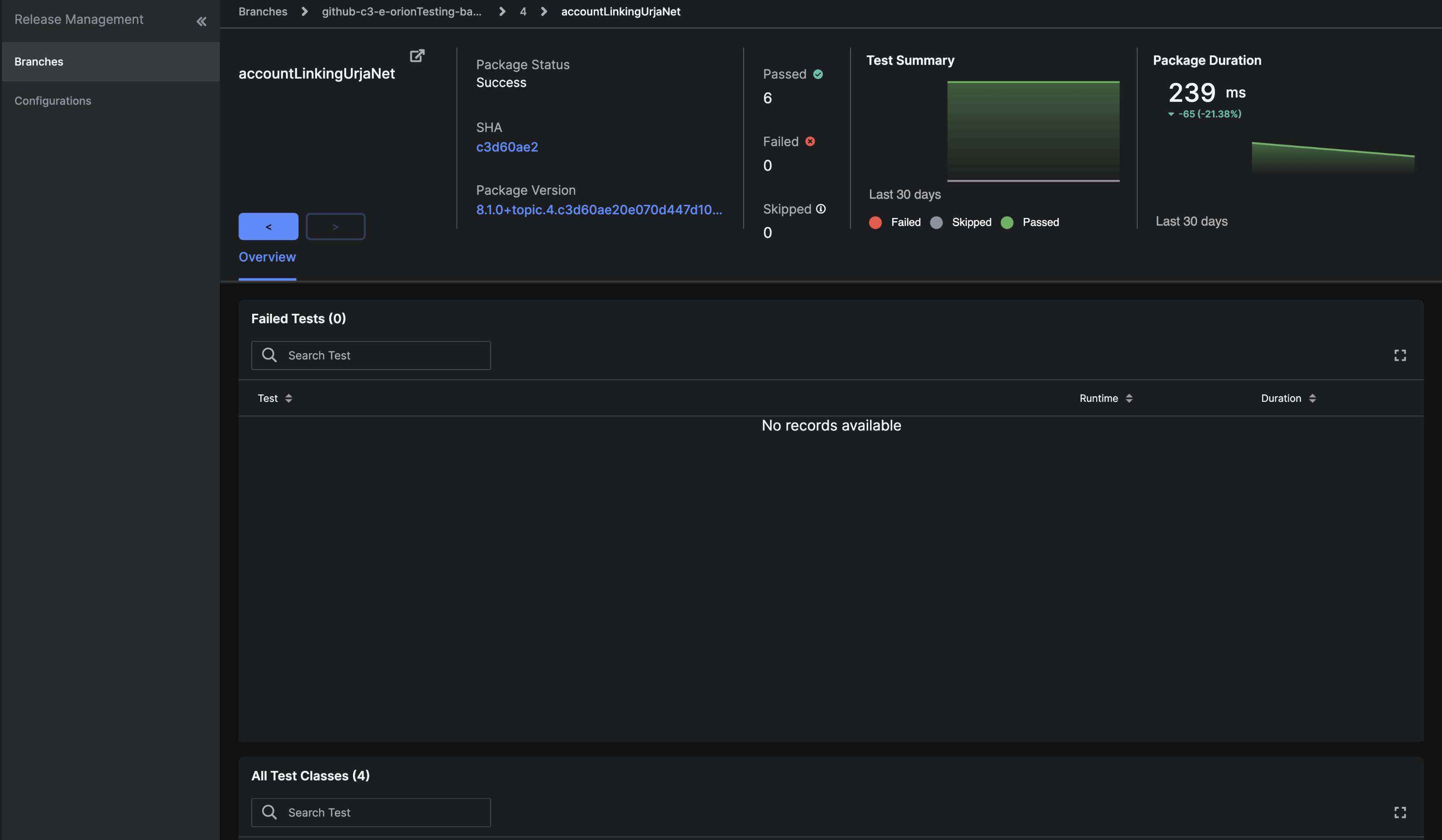 The Failed Test table shows no records, which means that there are no failed tests recorded. Notice that the status for this package is Success.
