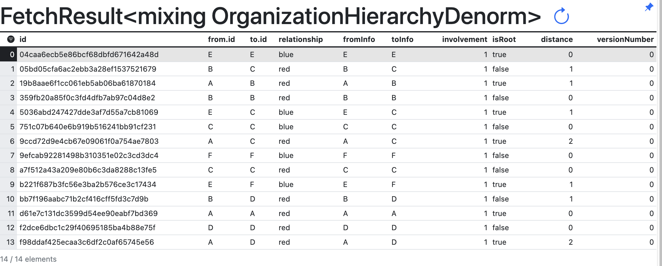 OrganizationHierarchyDenorm.denormalizeHierarchy()After hierarchy denormalization is complete, the results are populated in the OrganizationHierarchyDenorm Type. Run the command OrganizationHierarchyDenorm.fetch() in the static Console to see the following results: