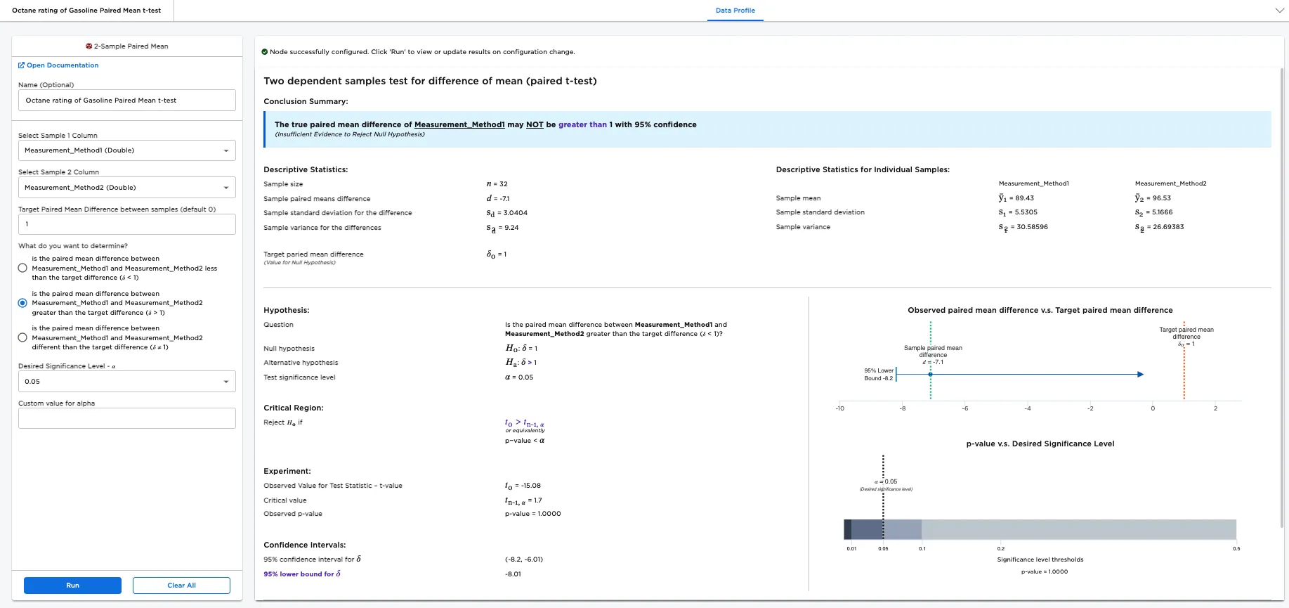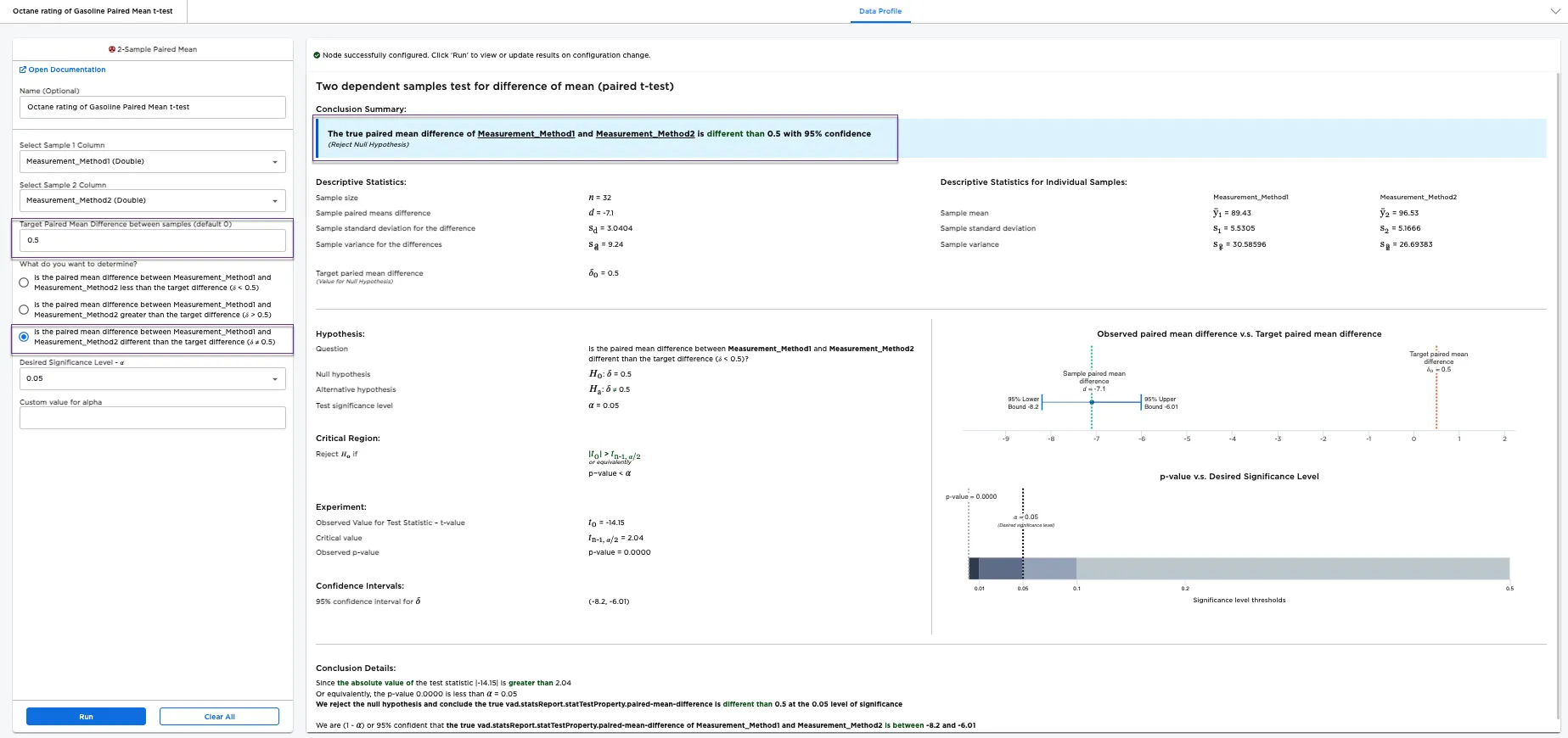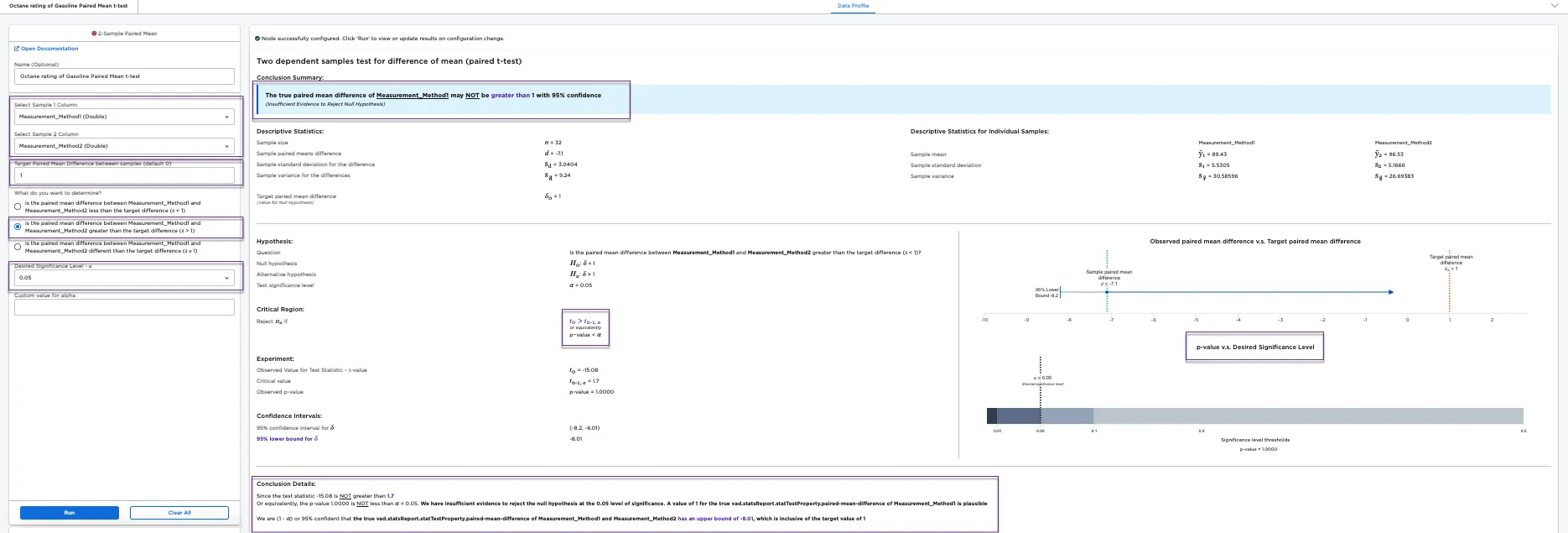 Octane rating is a measure of how heat resistant a fuel is in order to prevent knocking in the engine. Here, we consider two scientific methods to determine the Octane rating of a gasoline blend: Method 1 and Method 2. It is important to know the difference in the Octane rating produced by both methods. The 2-Sample Paired Mean node helps to analyze whether the methods measure Octane ratings differently. If yes, the analysis shows whether one method is consistently measuring the Octane rating greater than or lesser than the other method using a paired t-test, also called a two dependent-samples test for difference of means.