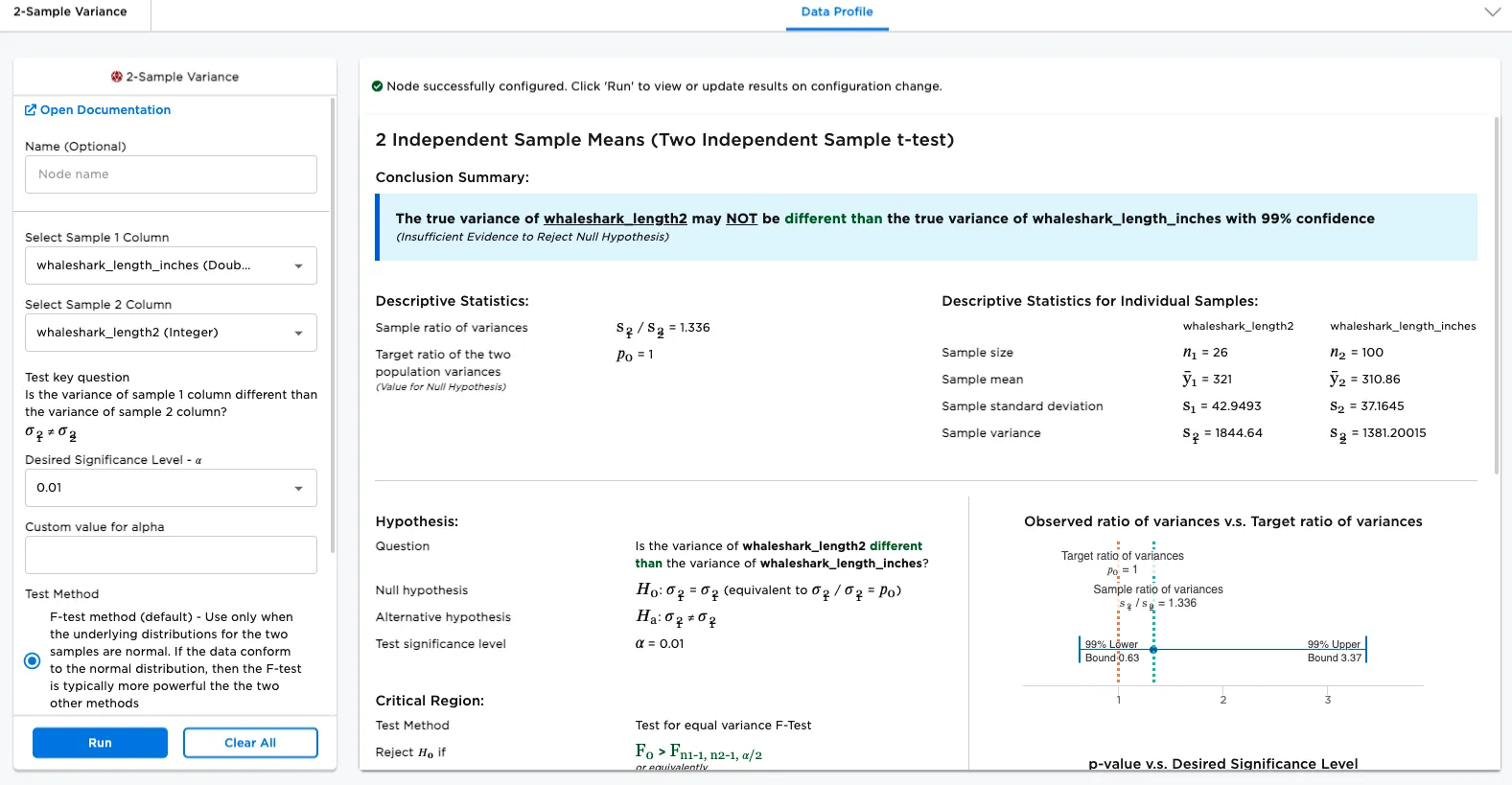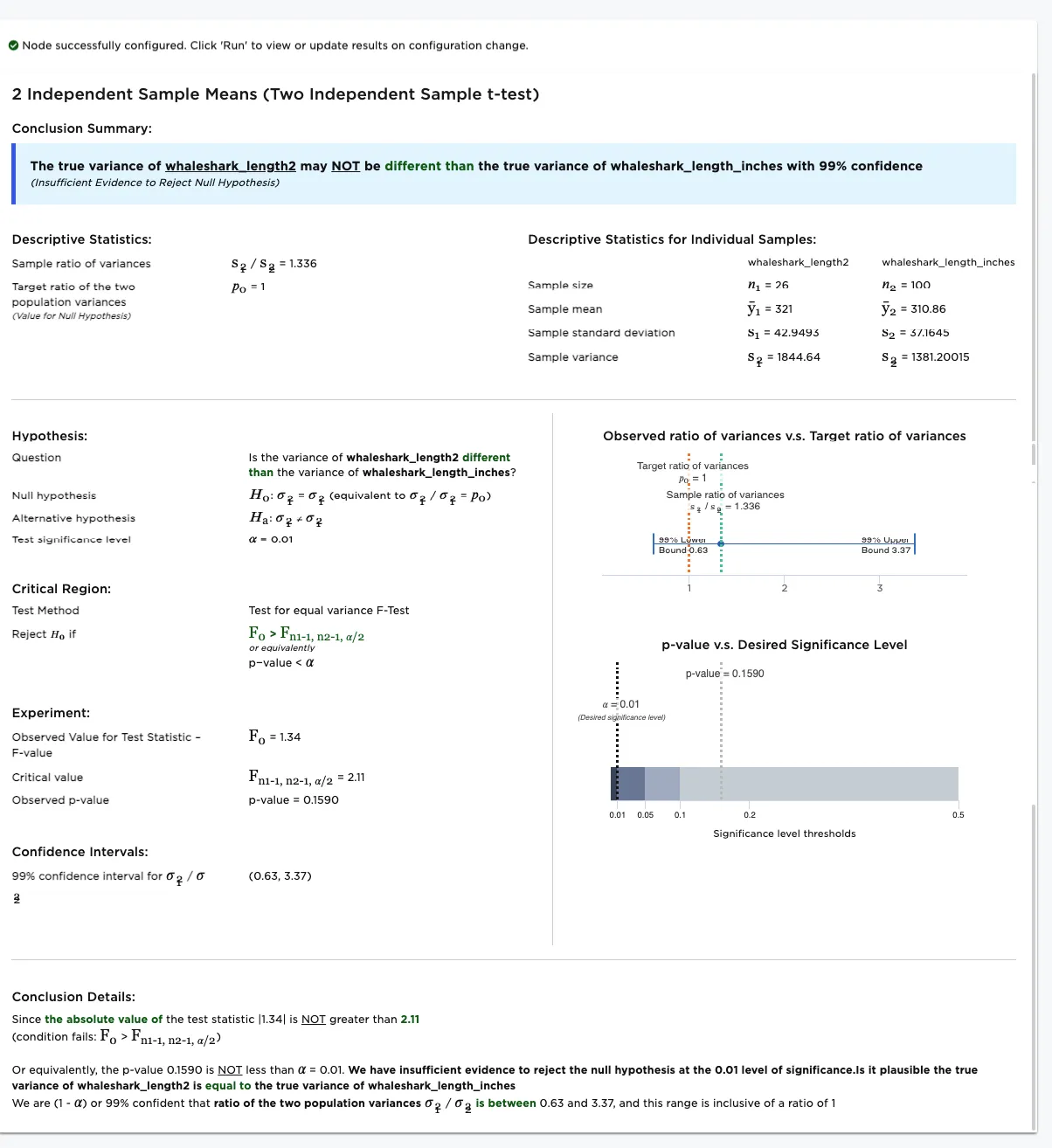 The node output provides details of its statistical calculations. The null hypothesis is that the two variances are equal. Visual Notebooks constructs test criteria based on a computed p value and a user chosen significance level (𝛼), which is .01. The test criteria is used to attempt to disprove the null hypothesis.