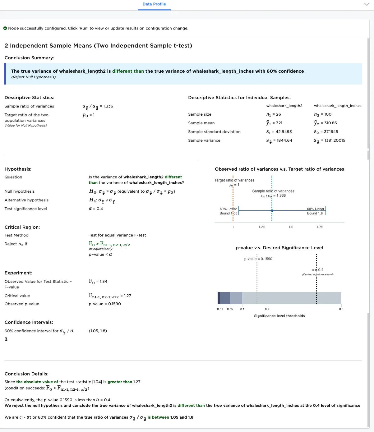 With this new significance level, Visual Notebooks concludes with 60% confidence that the two sets of data have different variances.