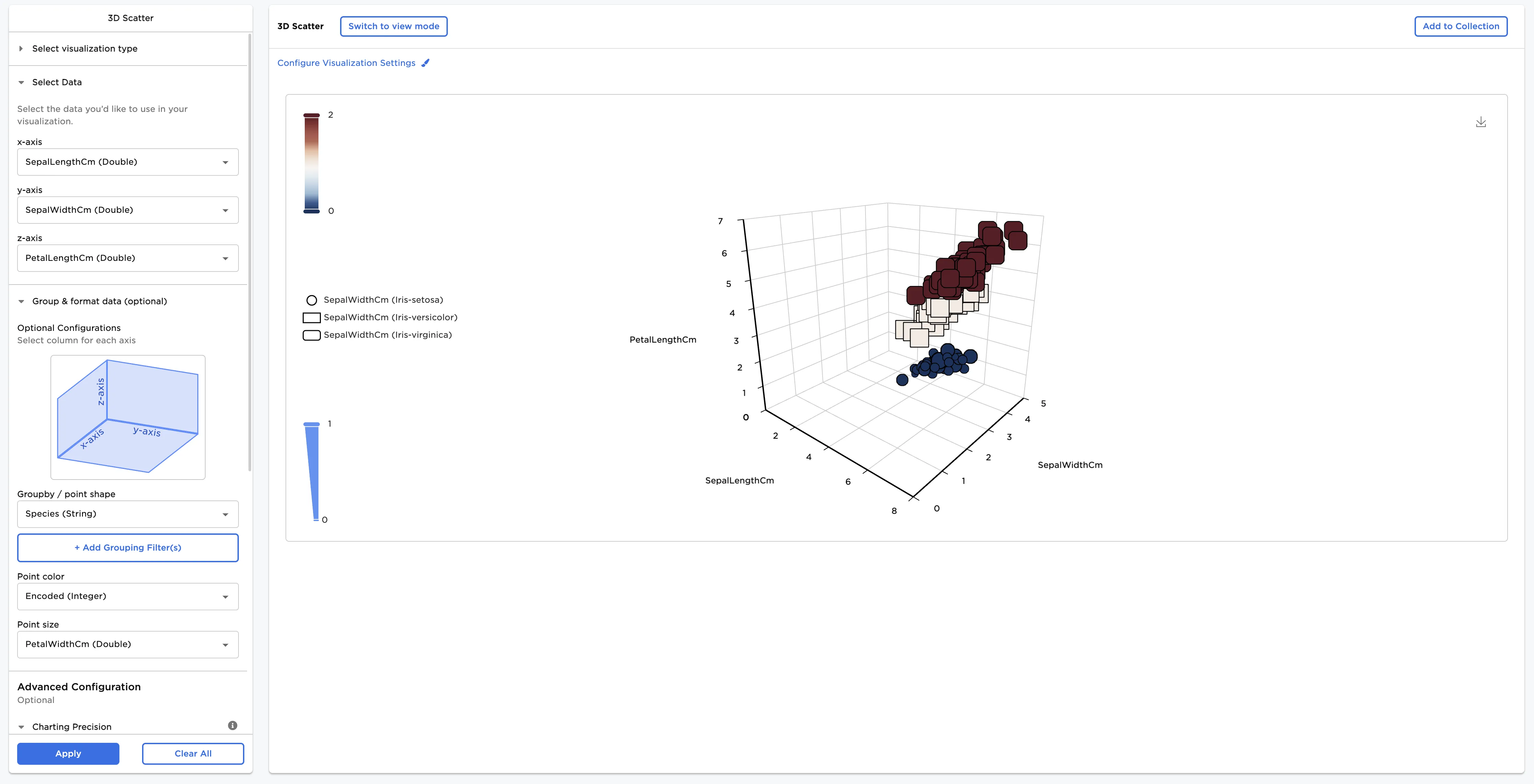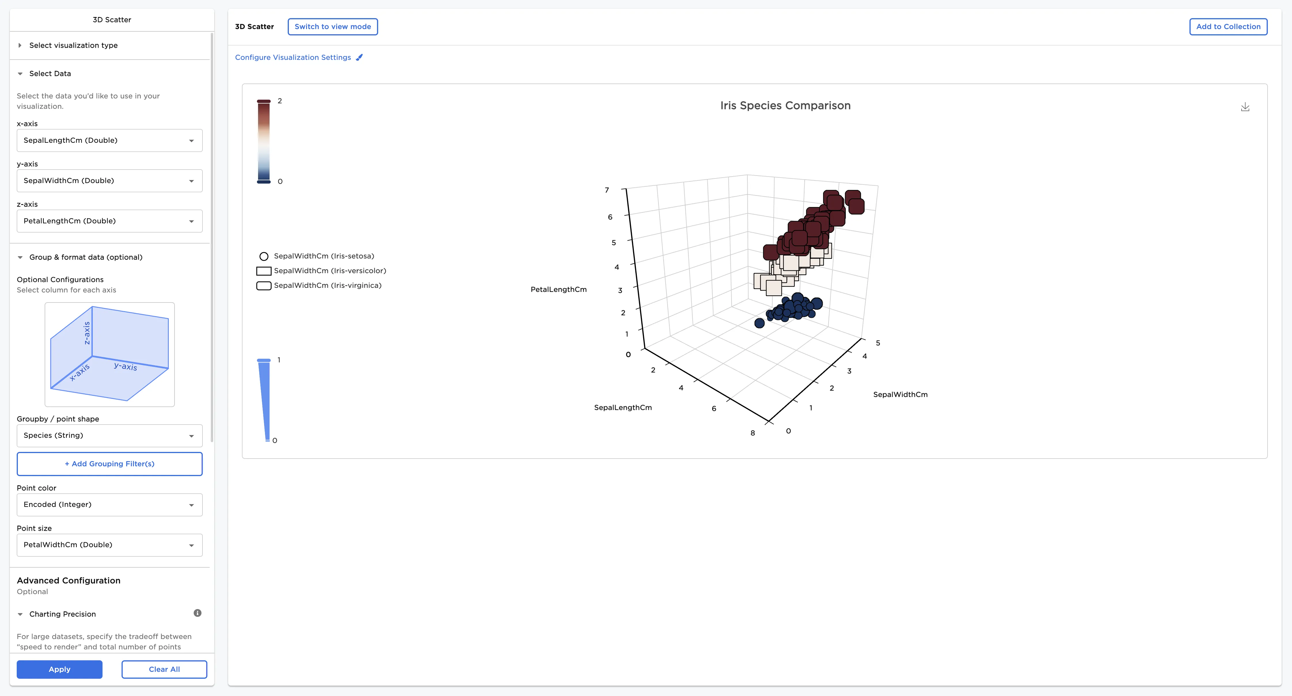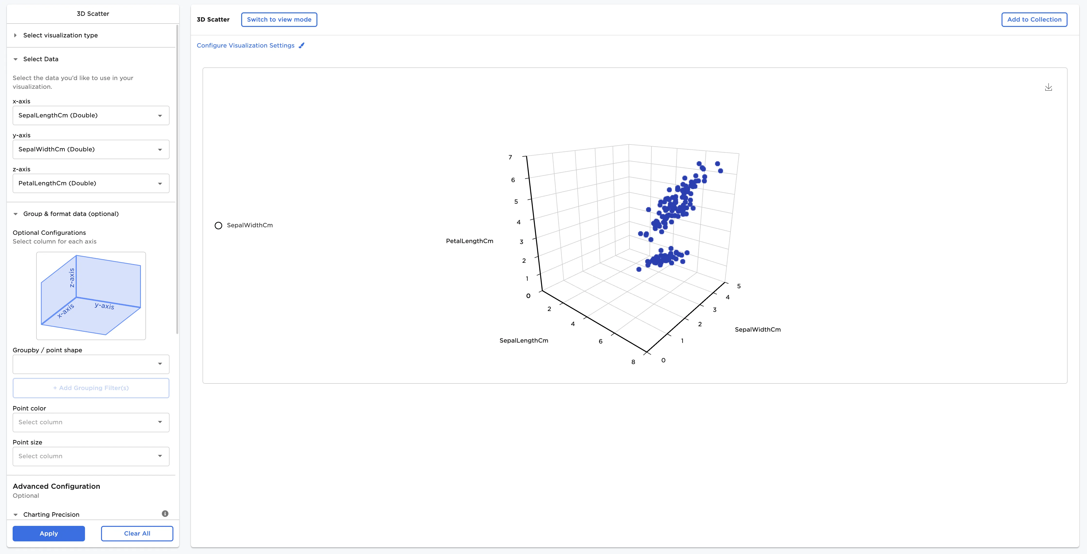- Select a field for the z-axis. In this case, PetalLengthCm is selected in the z-axis field.