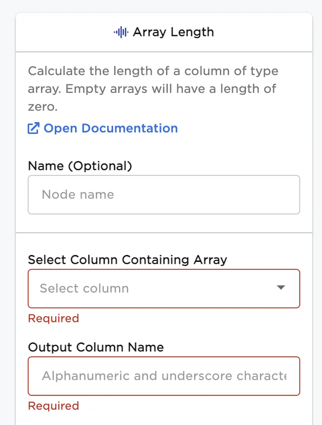 | Select Column Containing Array Required | Select single column of type Array - Select the input array column from which to calculate array lengths. |