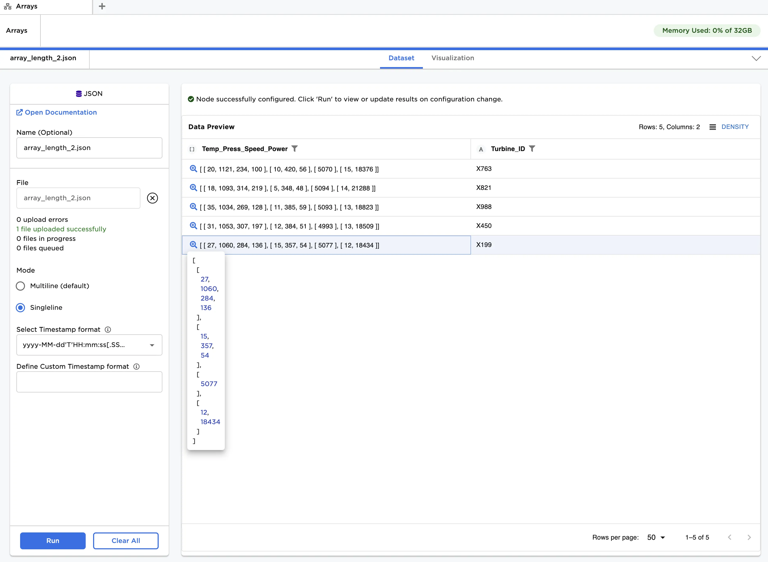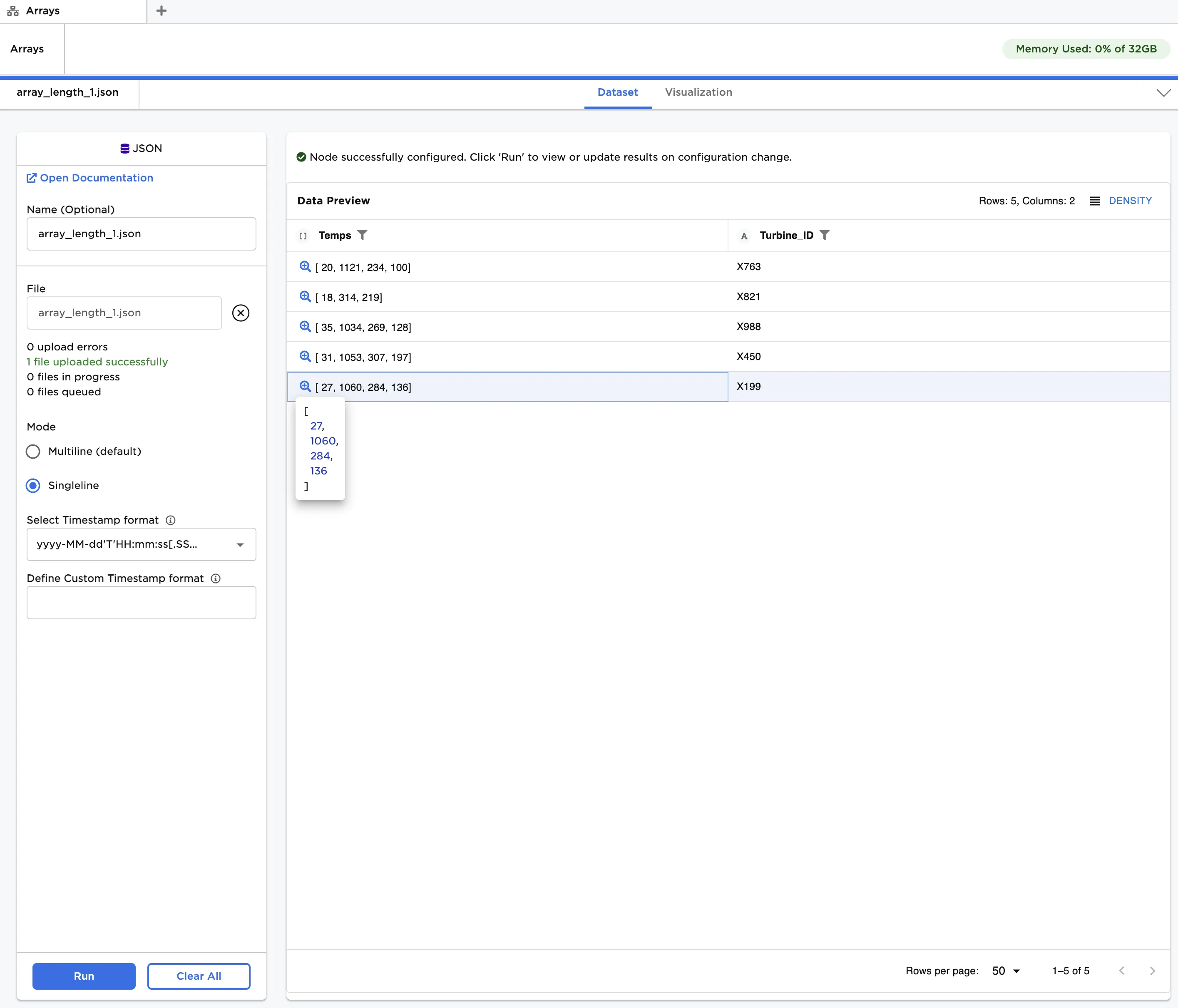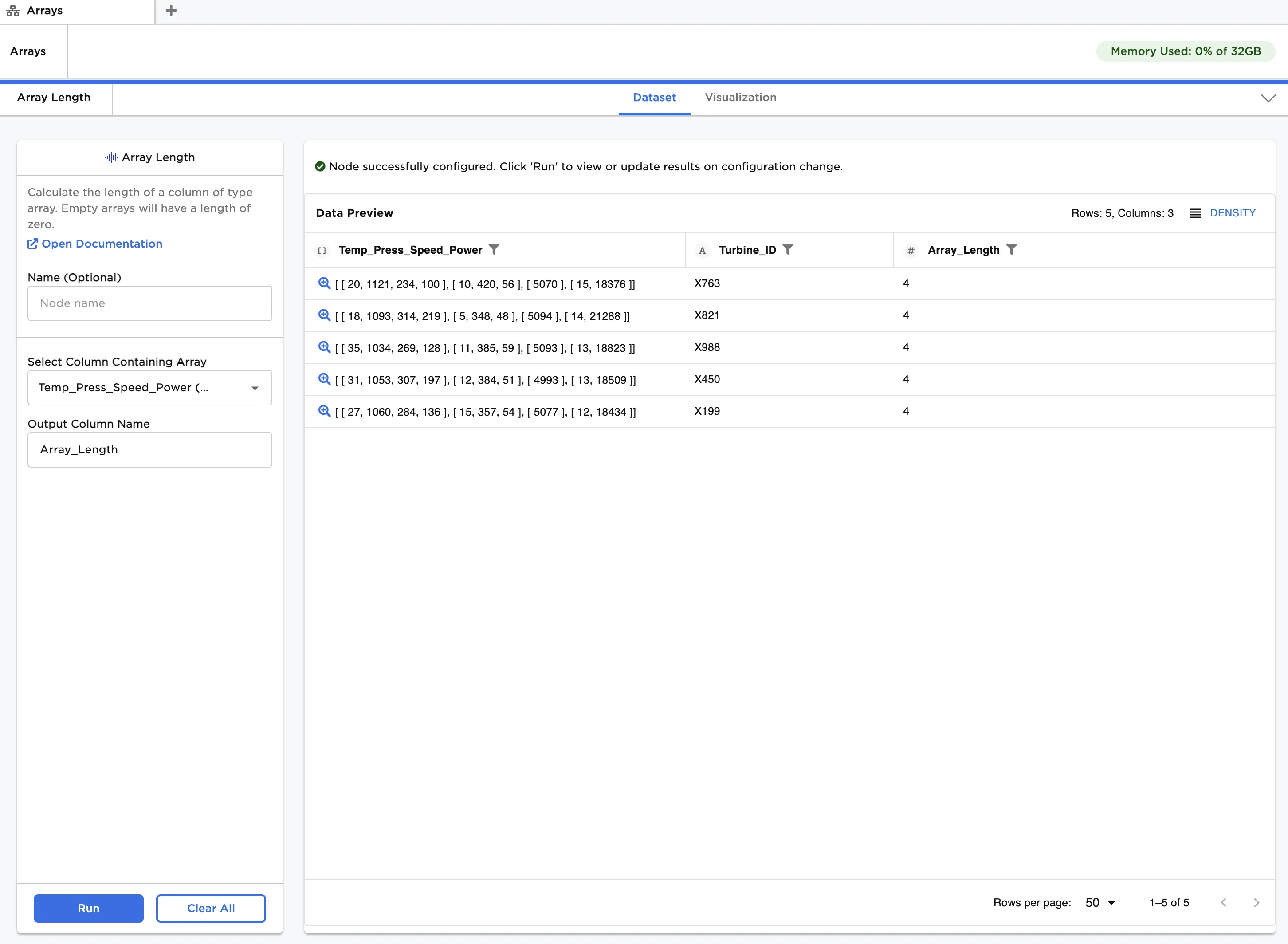 After running the node, a new column called "Array_Length" can be seen in Figure 3, indicating the number of entries in each array. From this, we see that the generator with "Turbine_ID" equal to "X821" has only three temperature measurements, while the others have four. In practice, this might result from a sensor issue we wish to investigate further.