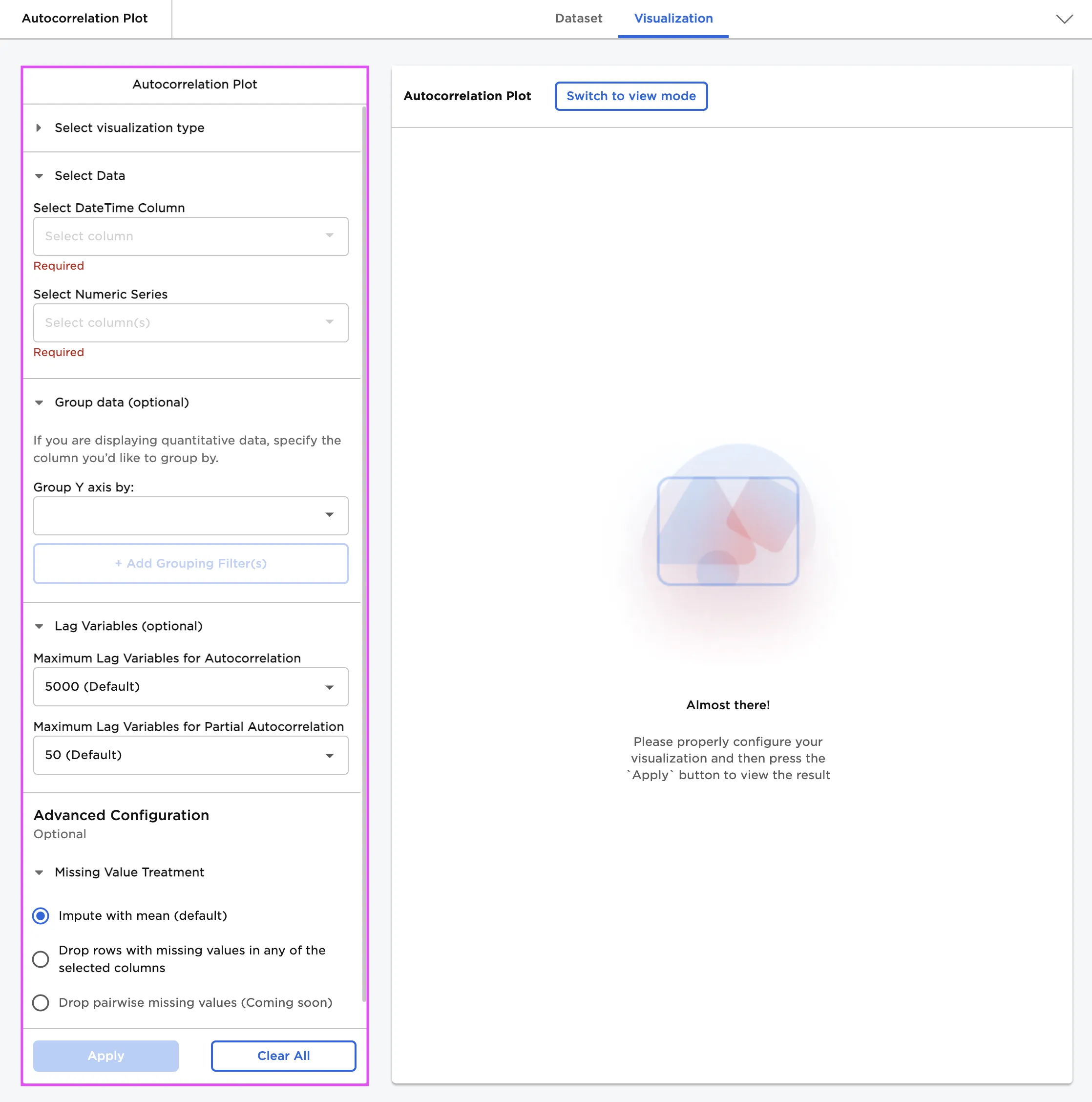 Select visualization type (default=Autocorrelation Plot) | The type of visualization - Use this field to switch to a different visualization node. |
