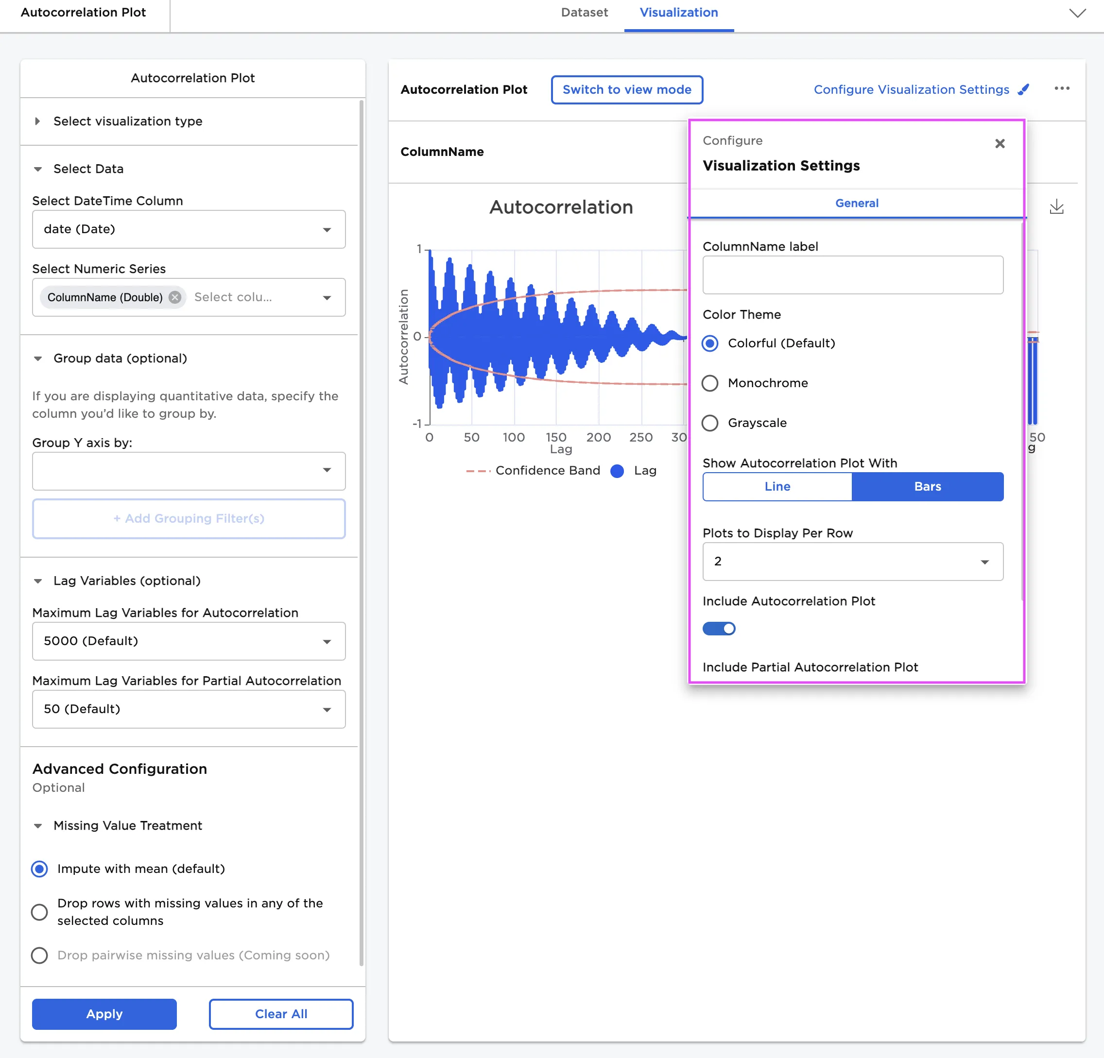 Include Autocorrelation Plot (default=On) | Show autocorrelation plot - Toggle this switch off to hide the autocorrelation plot. |